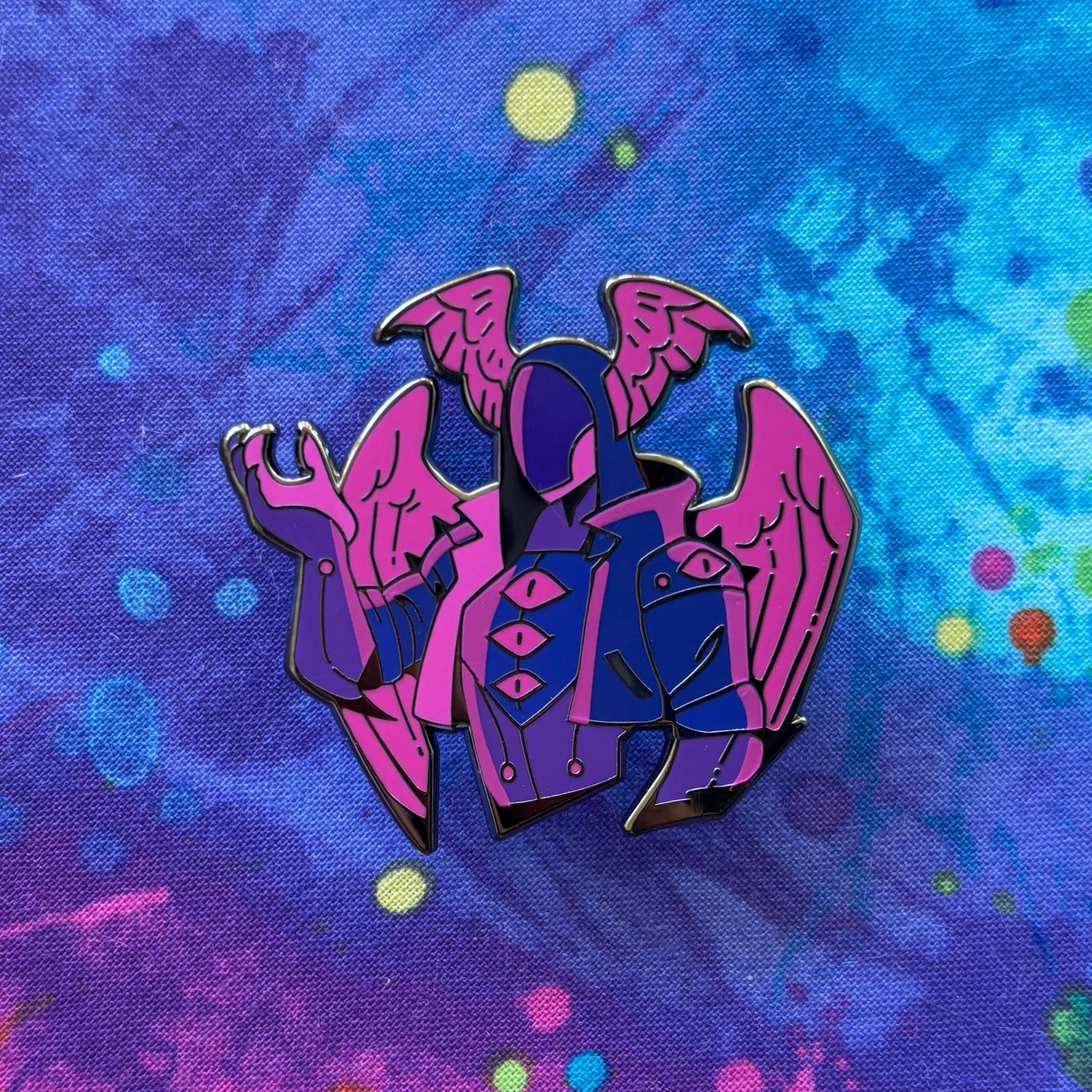This pin is 1.9 inches wide with black nickel plating and screenprinting. It has hard enamel and two pin posts with rubber backings.