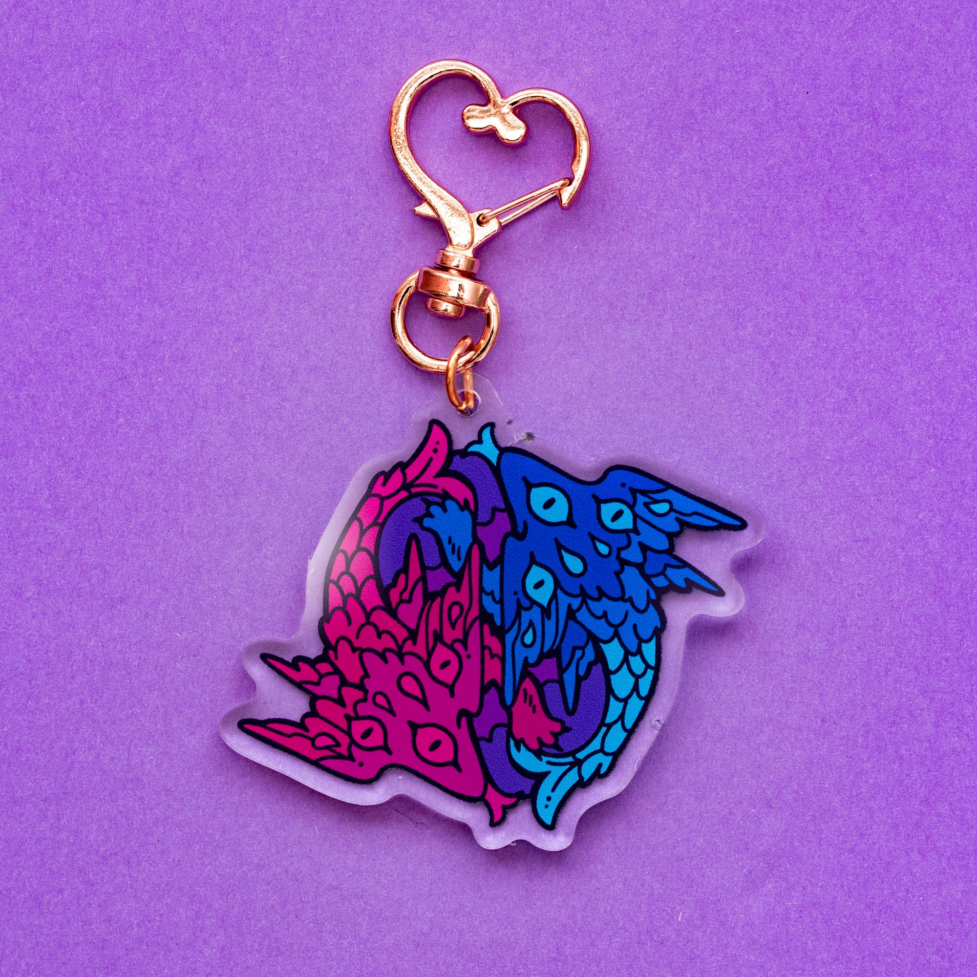 A pair of fish-tailed angels, for Bisexual pride.This acrylic keychain is 2.5 inches (6.3 cm) long, double-sided with the same print on both sides. The keychain has a rose gold heart-shaped clasp.Please note: the keychain comes with protective film that should be peeled off.