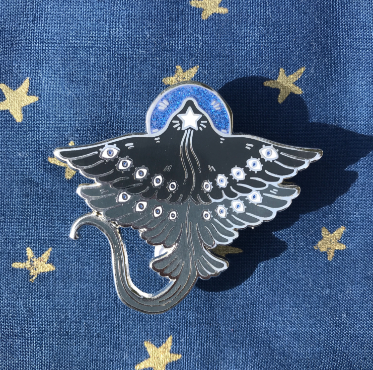 | This pin is silver plated, with glitter accents and hard enamel. It is 2 inches (5 cm) wide. It has two pin posts and rubber backings. |