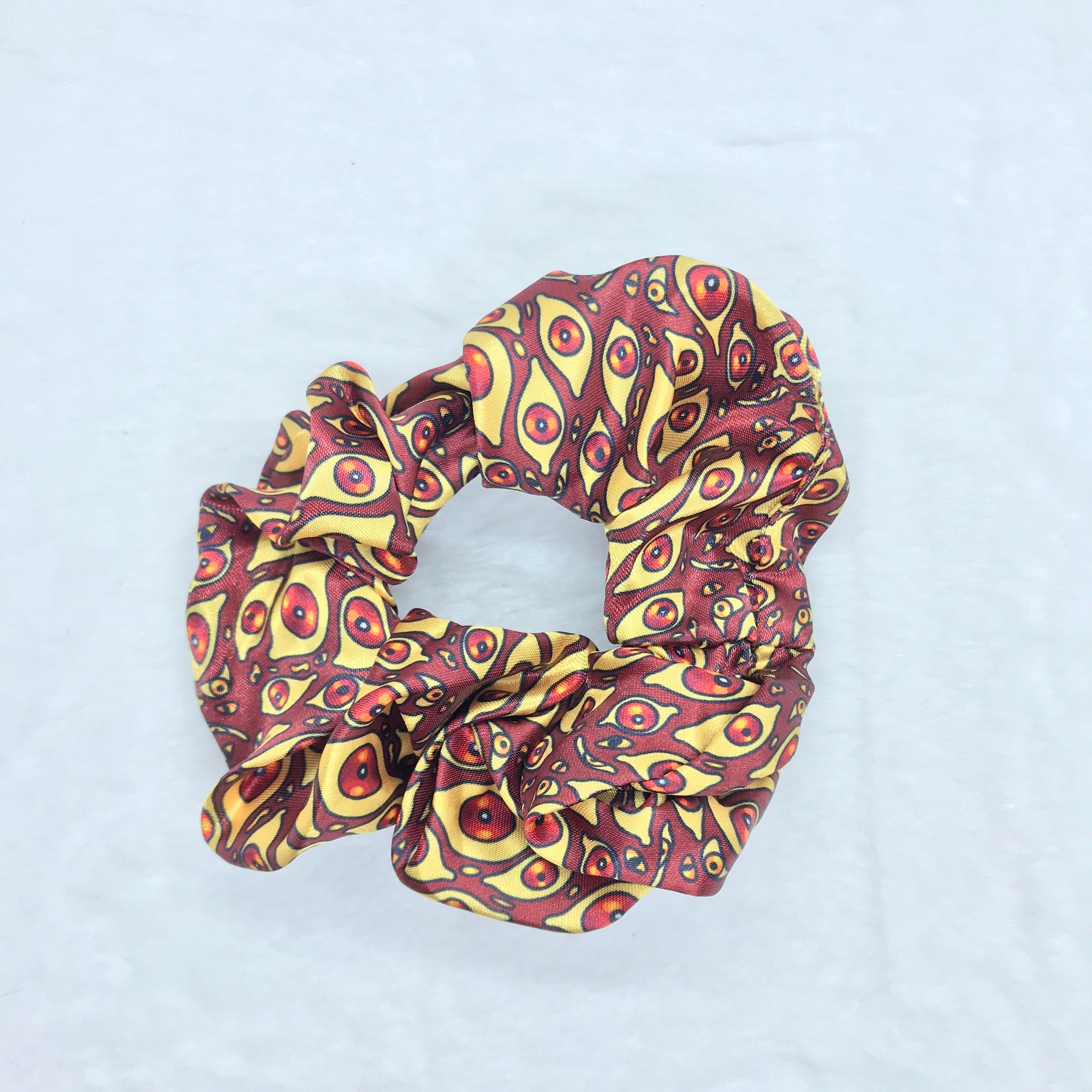 A pattern of red watchful eyes. This scrunchie is about 3.5 in (9 cm) in diameter, and made of shiny satin fabric.