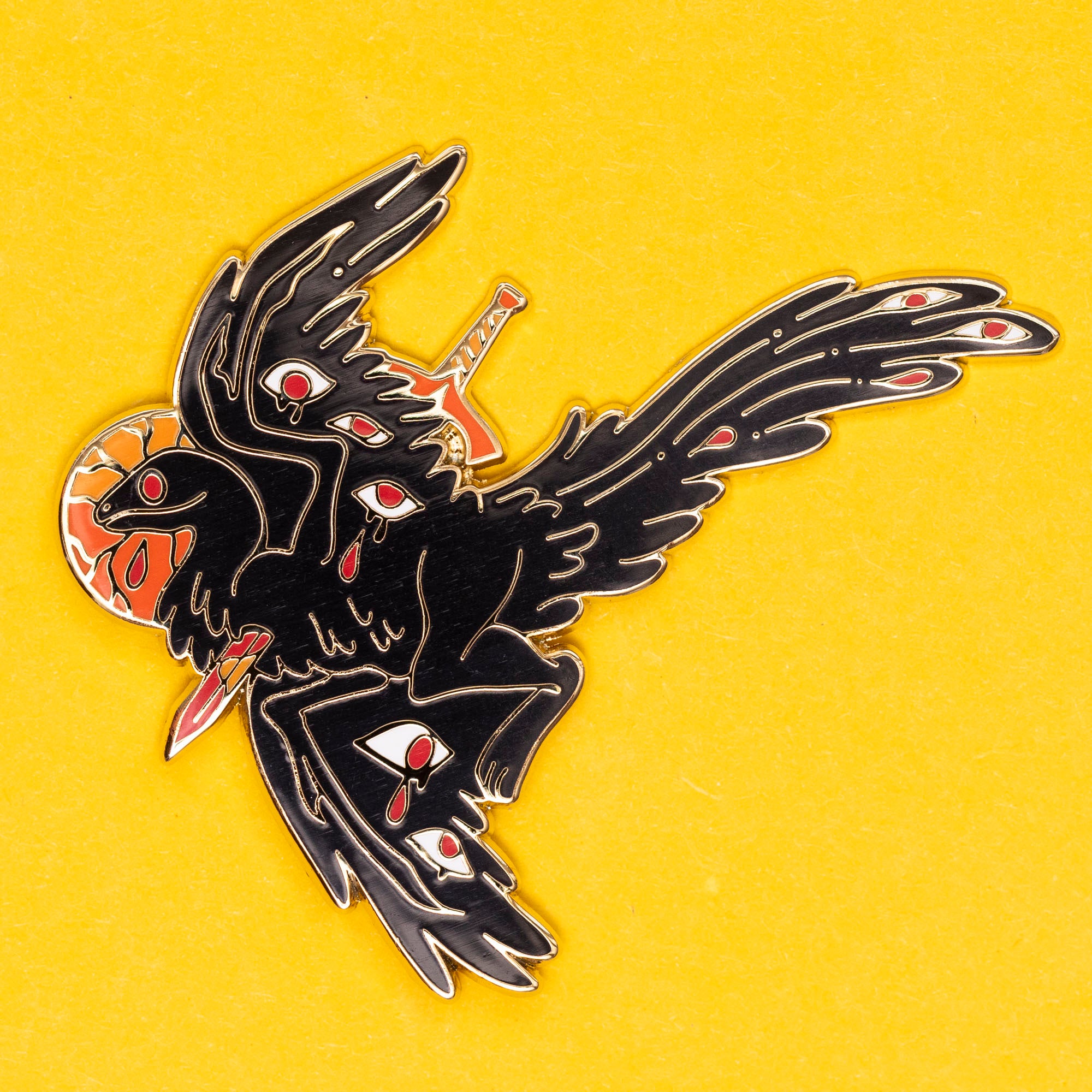 An angel who has strayed too far from grace.This pin is approximately 2 in (5 cm) wide. The pin has hard enamel, gold plating, and two pin posts with rubber clutches