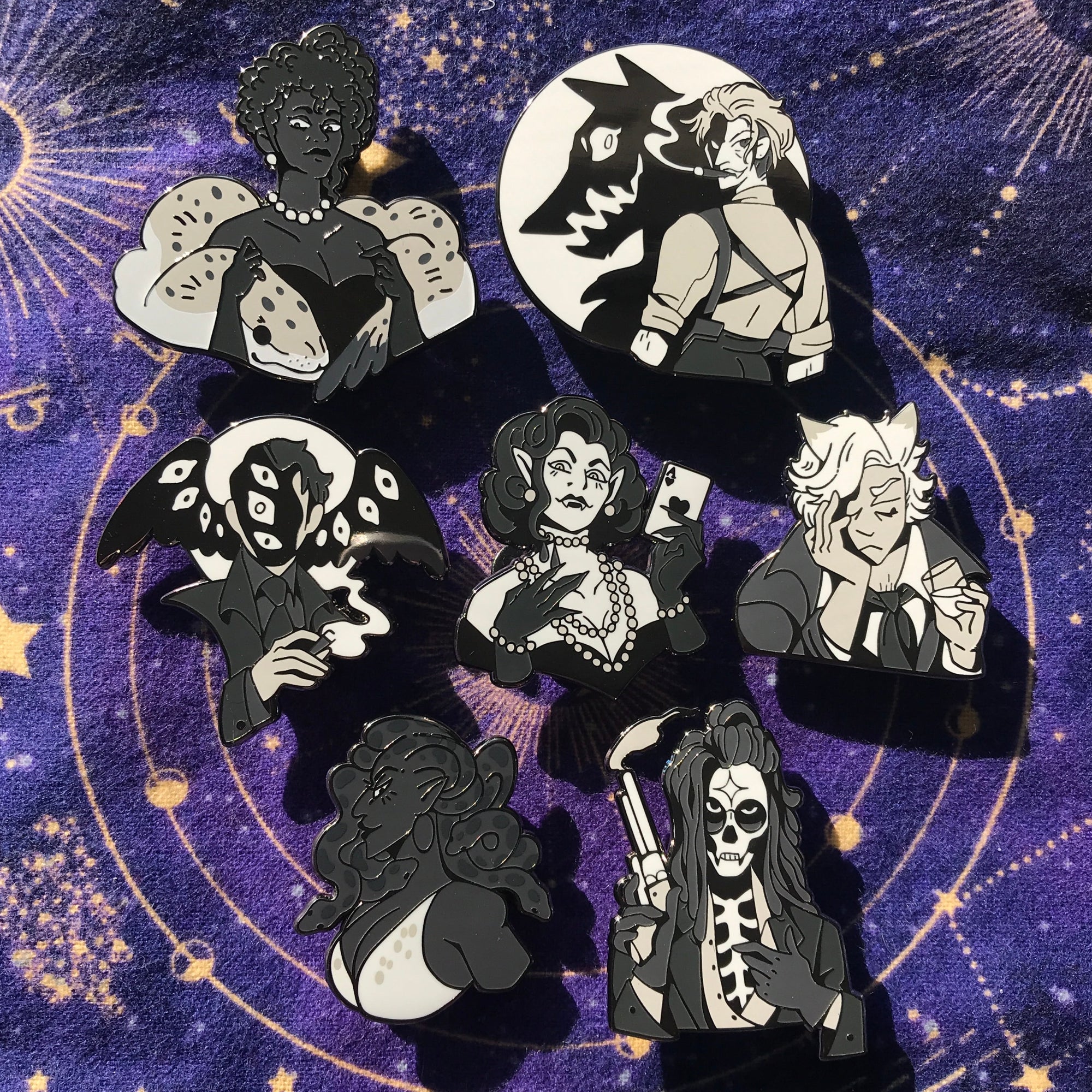 A mini series of my original characters in a film noir style! These pins are available individually or as blind bags. Each pin has black nickel plating, hard enamel, two pin posts, and rubber backings.