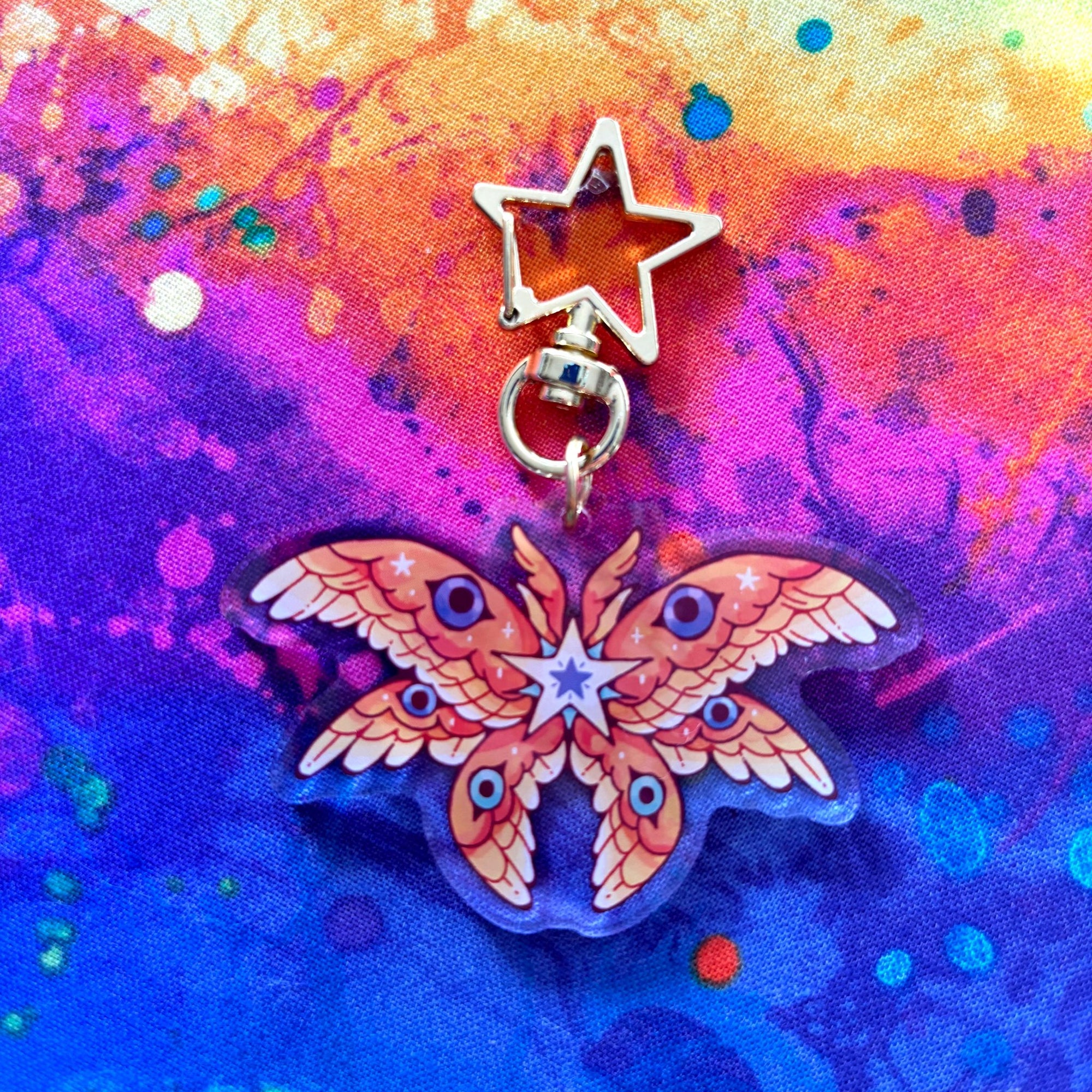 This acrylic keychain is 2.5 inches (6.3 cm) on the longest side, double-sided with the same print on both sides; it has a gold star clasp.