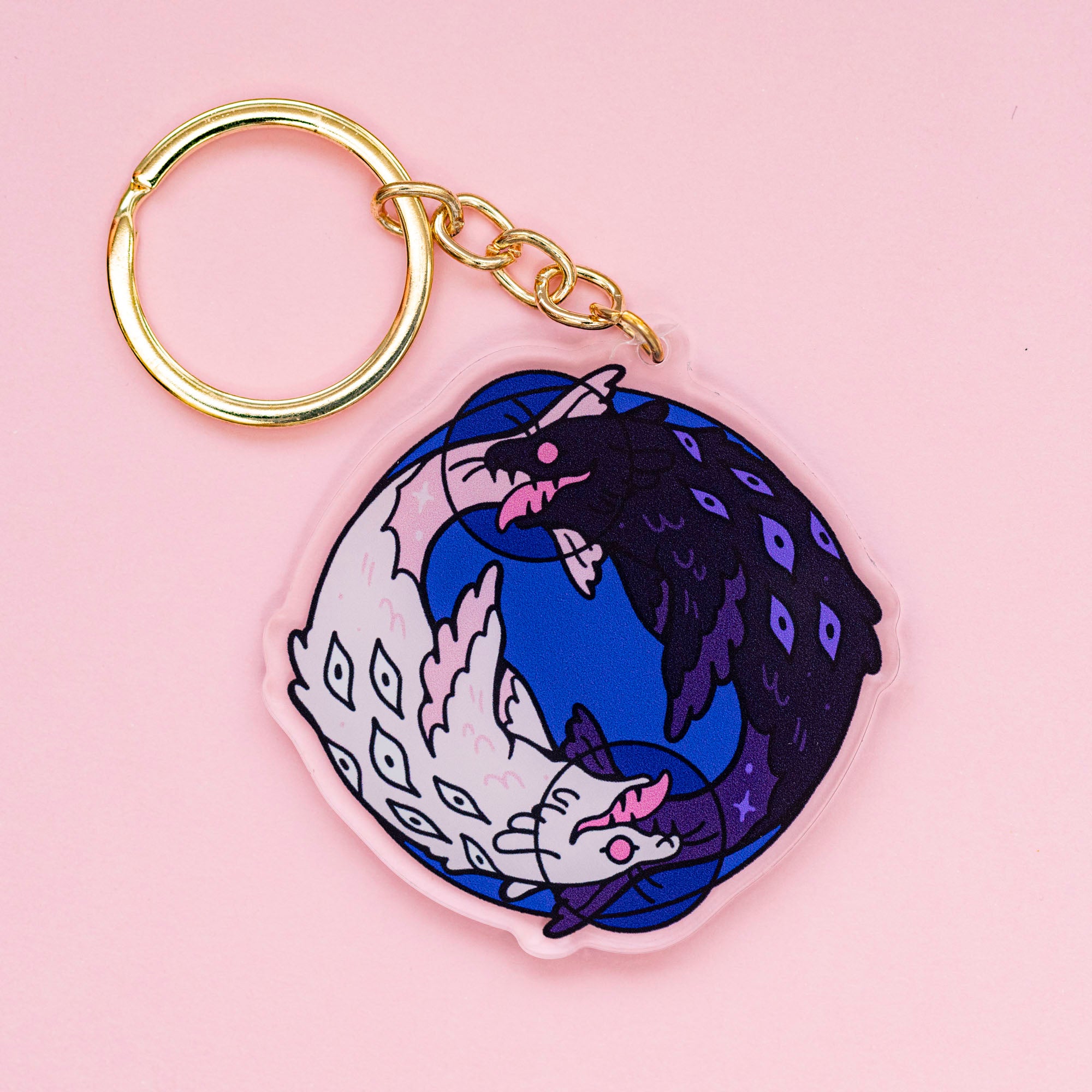 A pair of eldritch seal angels, for Genderfluid pride.This acrylic keychain is 2.5 inches (6.3 cm) long, double-sided with the same print on both sides. The keychain has a gold circle clasp.Please note: the keychain comes with protective film that should be peeled off.
