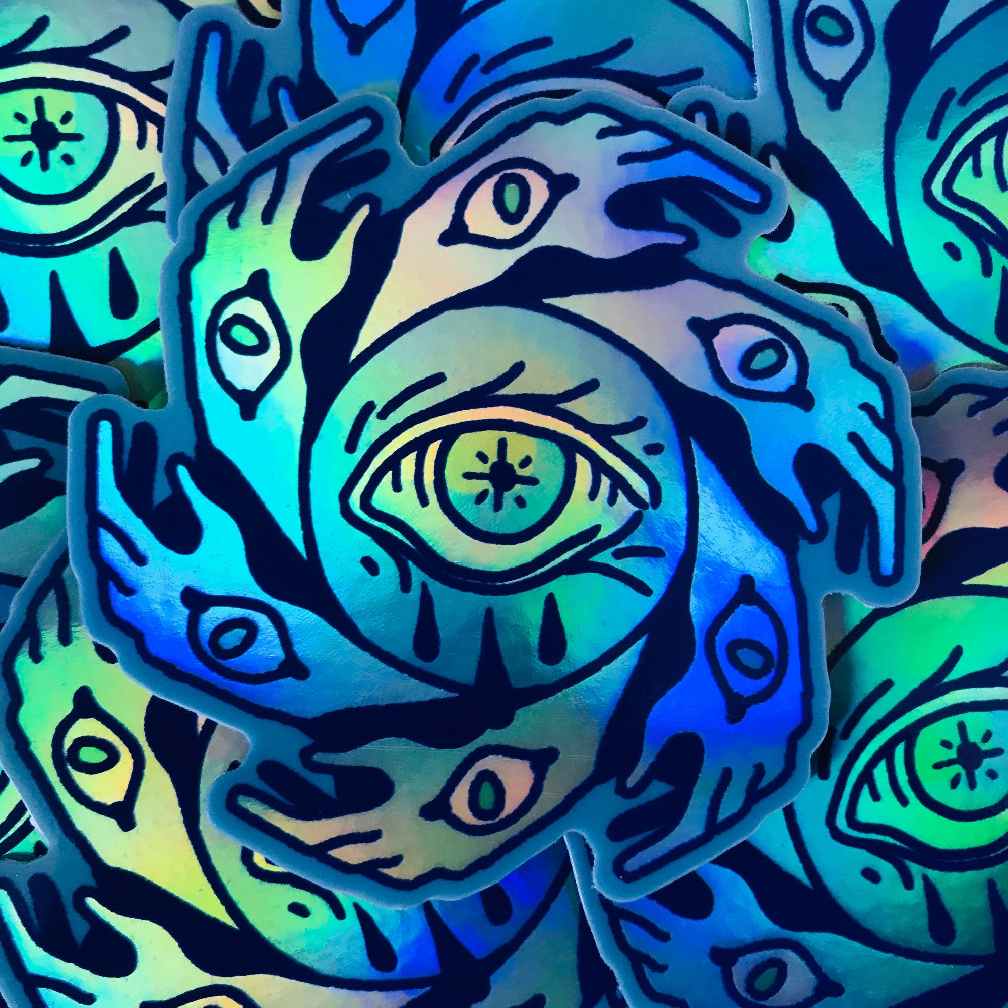 An angel of many hands. This sticker is approximately 3 inches (7.6 cm) on the longest side. It is printed on holographic glossy vinyl.