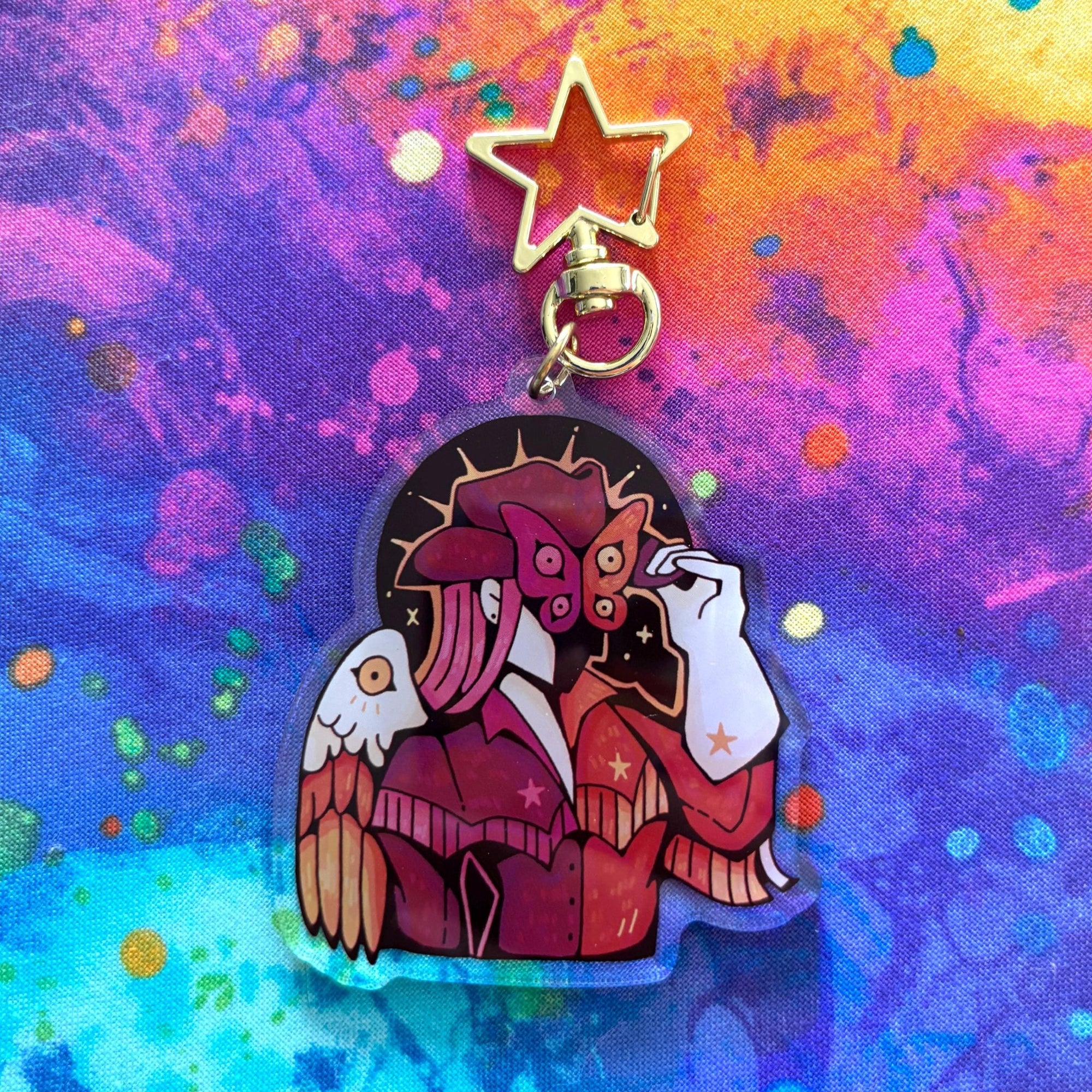 | This acrylic keychain is 2.5 inches (6.3 cm) on the longest side, double-sided with the same print on both sides; it has a gold star clasp. |