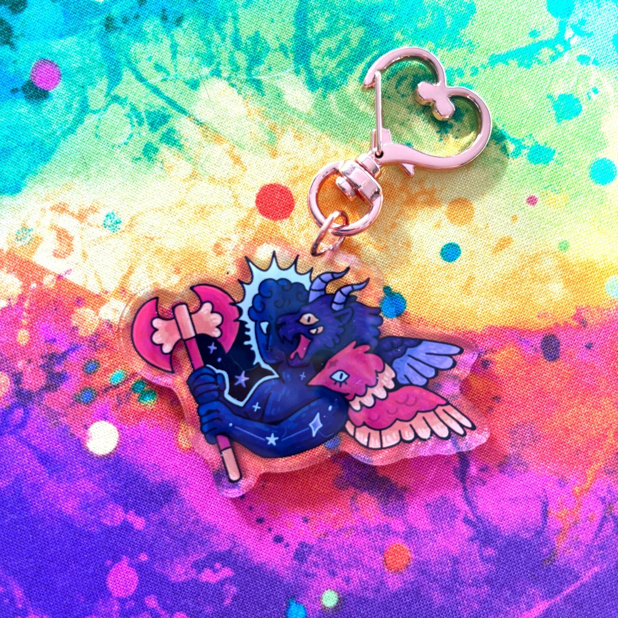 | This acrylic keychain is 2.5 inches (6.3 cm) on the longest side, double-sided with the same print on both sides; it has a rose gold star clasp. |