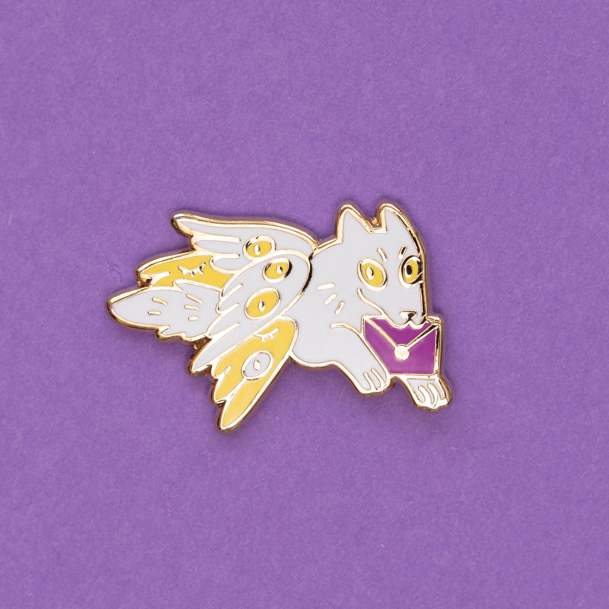 A helpful little heavenly messenger hound, with a purple envelope in his mouth.Each pin is approximately 1 inches (2.5 cm) long. Each pin has rubber clutches, hard enamel, and gold plating.