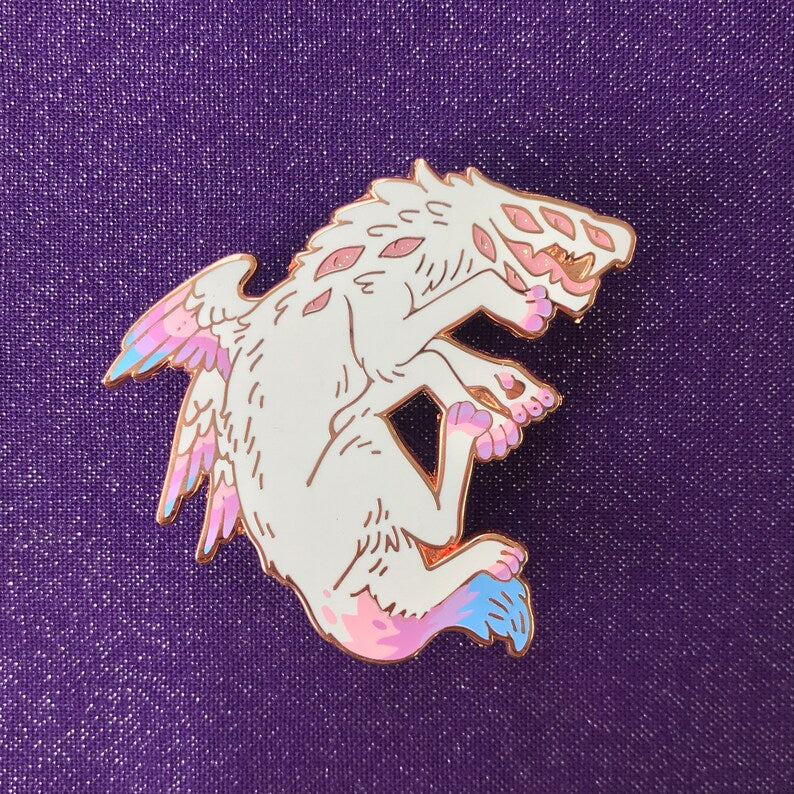 My original character Sam in his monstrous angelic hound form! He is full of teeth, eyes, and love. Sam is 1.7 in (4.5 cm) long, and features hard enamel, rose gold plating, recessed metal, and screen-printing. This listing is for standard grade pins only. Standard grade pins may have one or two tiny imperfections.