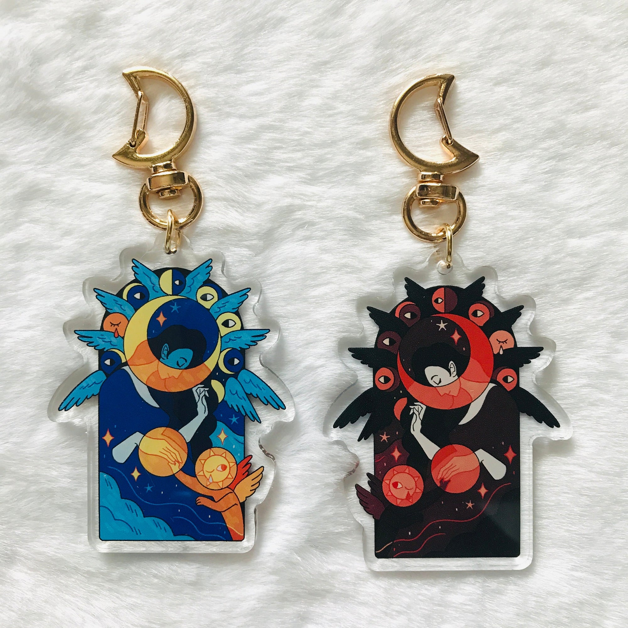This acrylic keychain is 2.5 inches (6.3 cm) long, double-sided with a different print on each side. The keychain has a gold moon clasp.