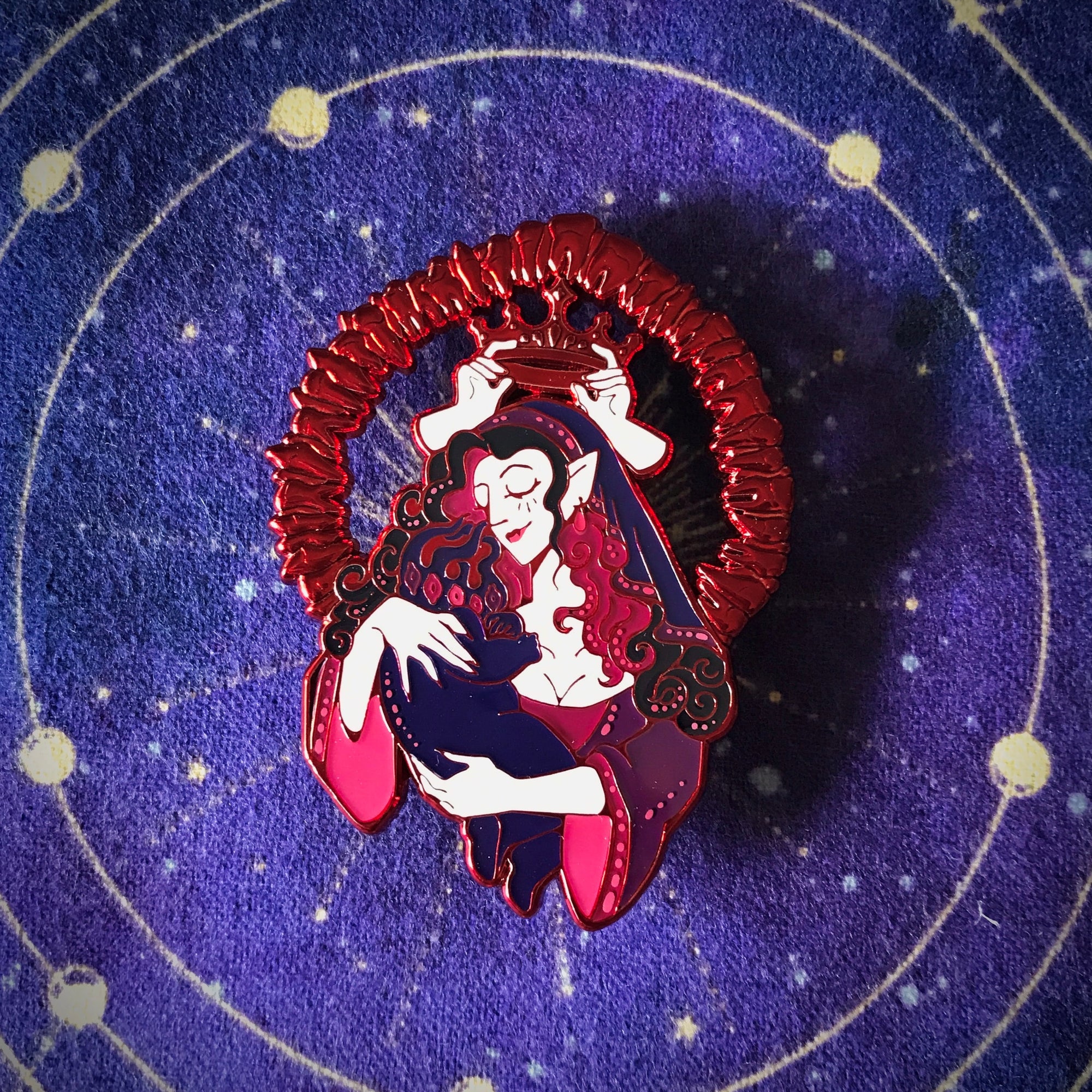 This pin is 2.5 inches (6.3 cm) long, and features red chrome plating, screenprint, and soft enamel with epoxy. It has two pin posts and rubber backings.This listing is for seconds grade pins. For my complete pin grading policy, please see my About & FAQ: linktr.ee/ultra.infinite