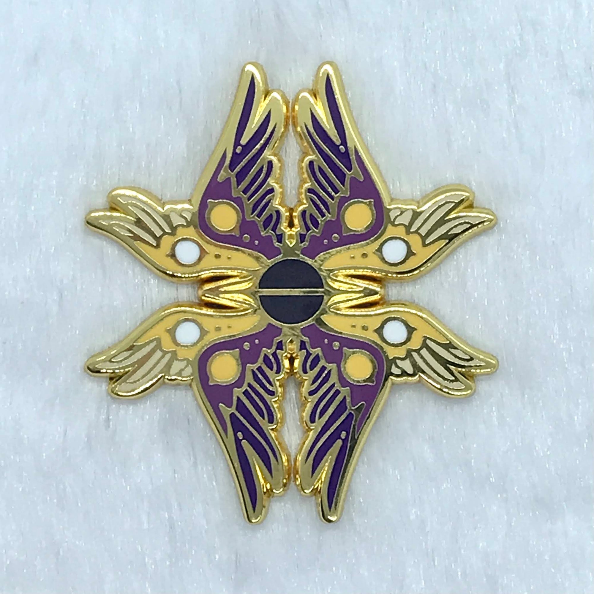 A black hole seraph with purple and yellow wings, for Nonbinary pride. This pin is approximately 1.6 in (4 cm) wide.