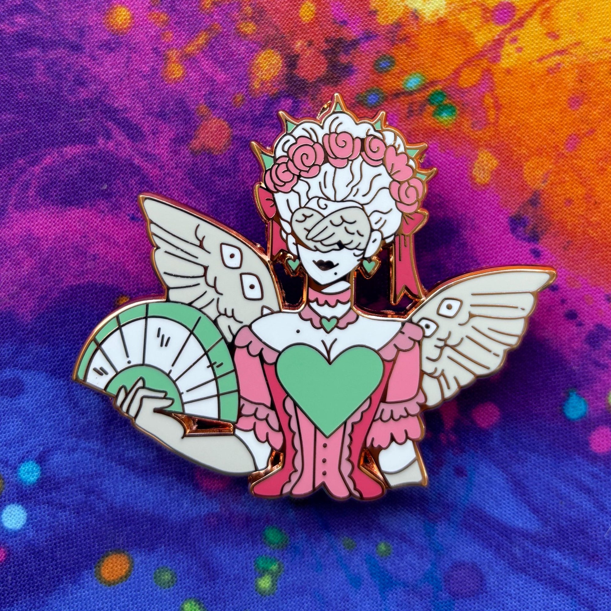 Hard enamel, rose gold plating, two pin posts. About 2.4 inches wide.