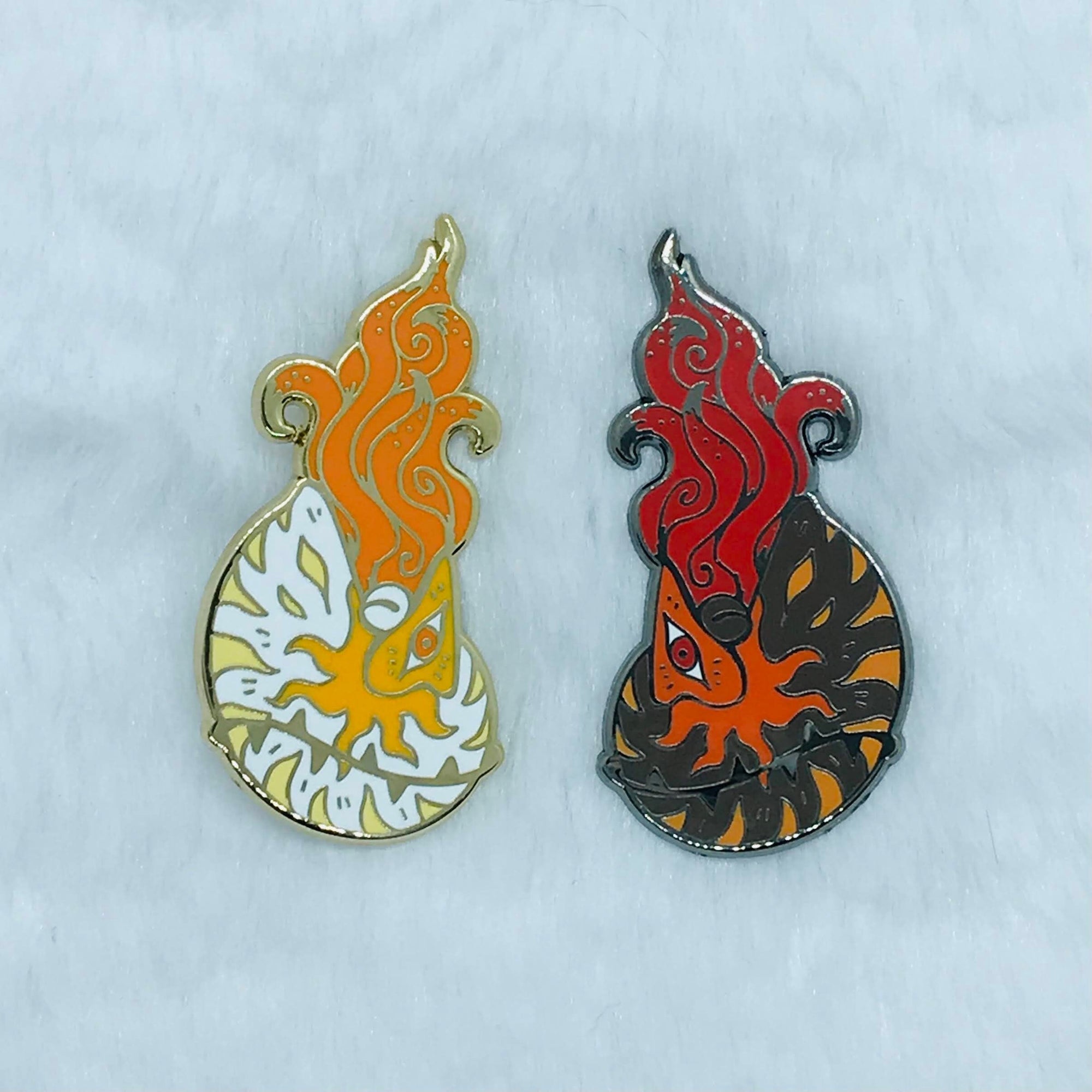 A holy nautilus with fiery tentacles.These pins are approximately 1 in (2.5 cm) wide. Each pin has hard enamel and two pin posts with rubber clutches.