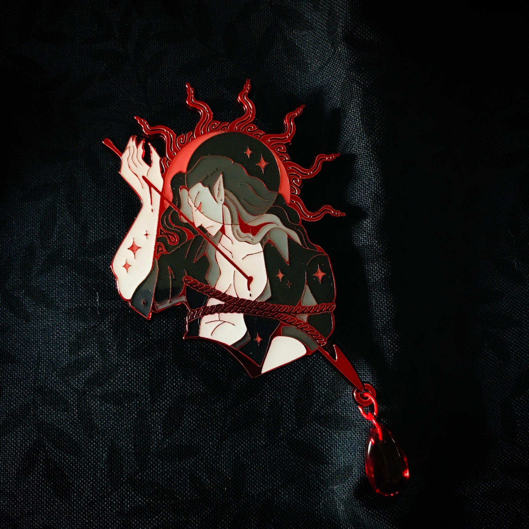 This pin is 2.3 inches (5.8 cm) long, with soft enamel and epoxy, red chrome plating, and a teardrop dangle charm. It has two pin posts and rubber backings.This listing is for seconds grade pins. For my complete pin grading policy, please see my About & FAQ: linktr.ee/ultra.infinite