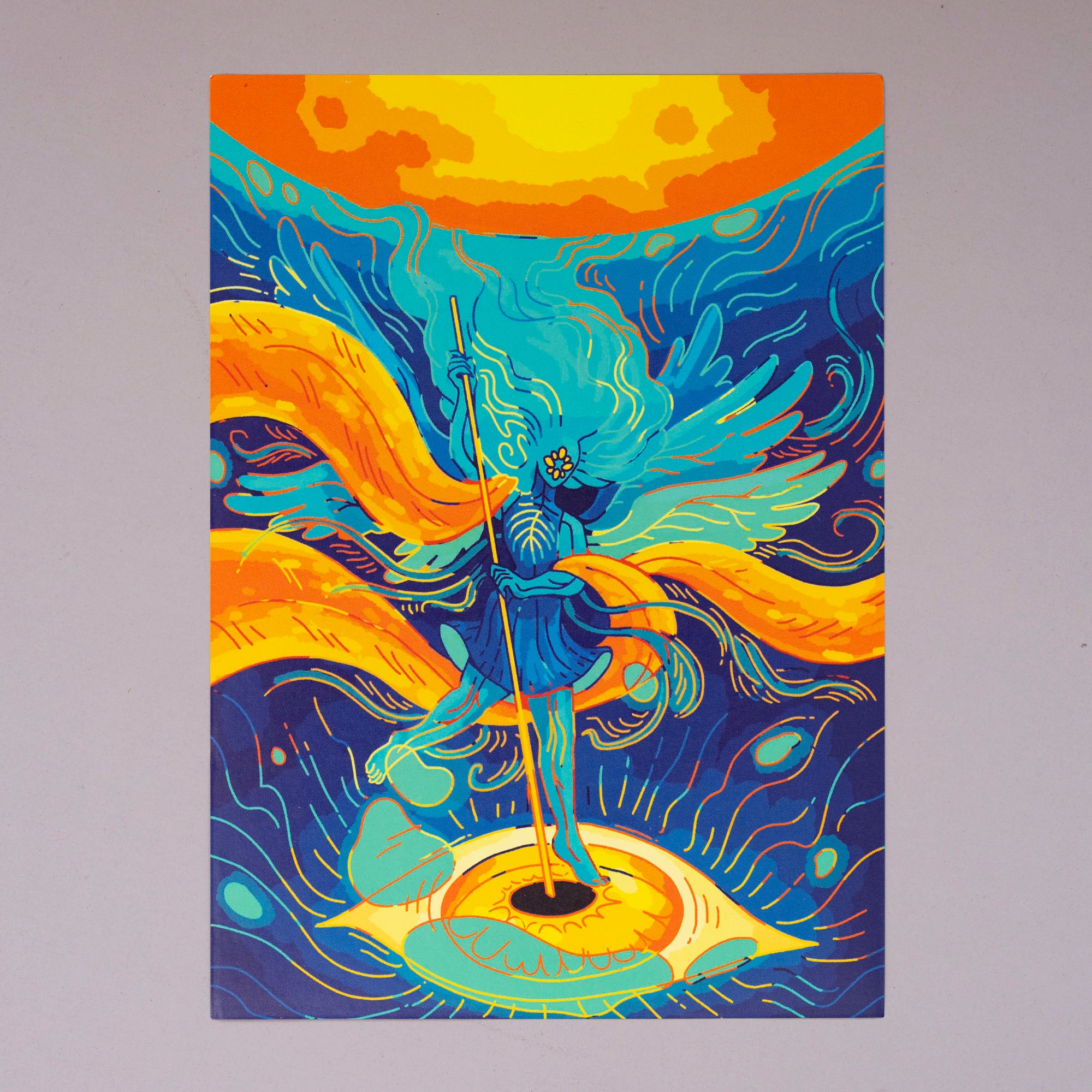 Talia Overwhelming the Entity, inspired by β€œSt. Michael Overwhelming the Demon,” by Raphael. The print is 5 x 7 inches (12 x 17 cm) with a matte finish. The paper stock is thinner than expected with some flawed edges, so it is discounted