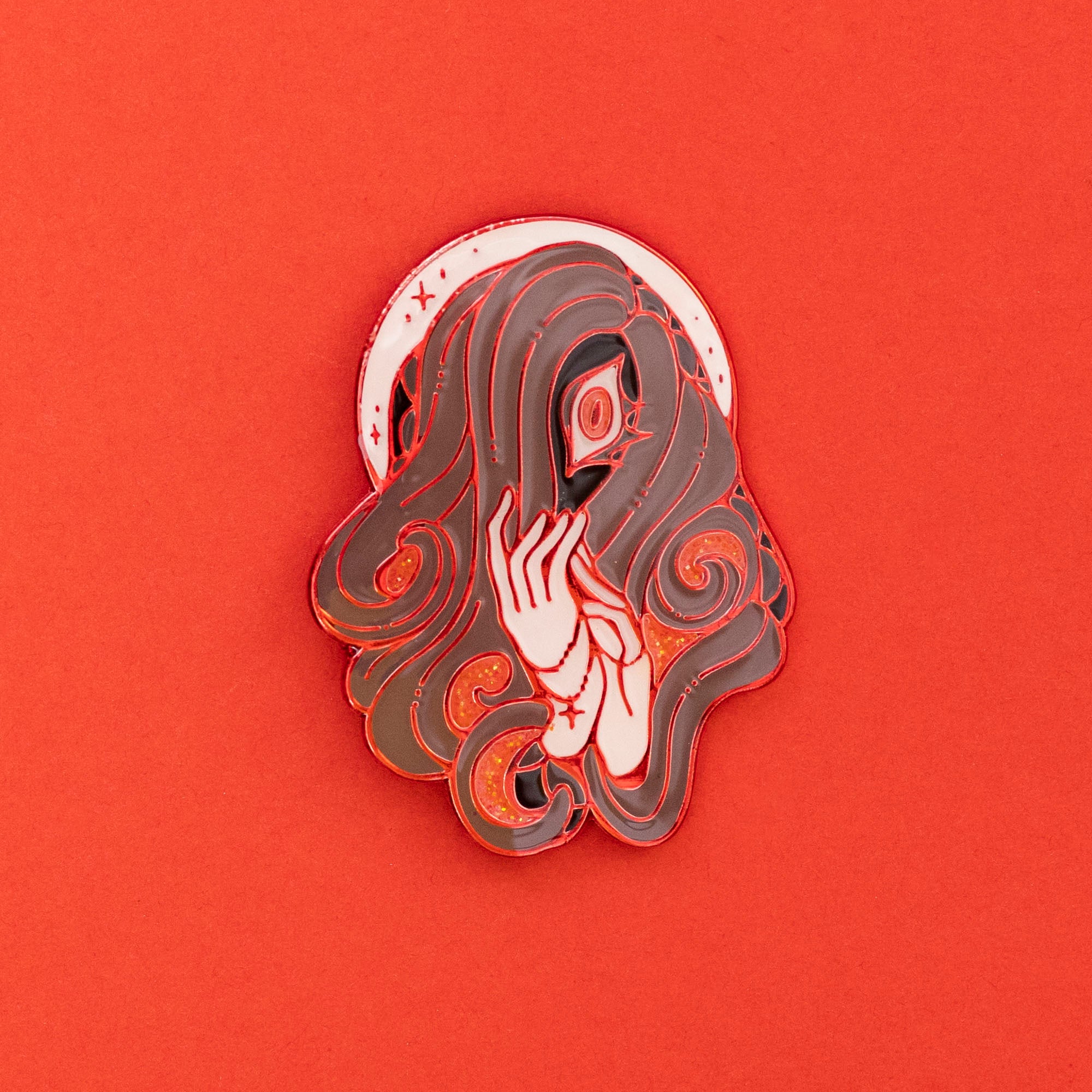 The pin is 1.5 inches (4 cm) long. It has two pinbacks with rubber clutches, soft enamel with epoxy and glitter accents, and red chrome plating.