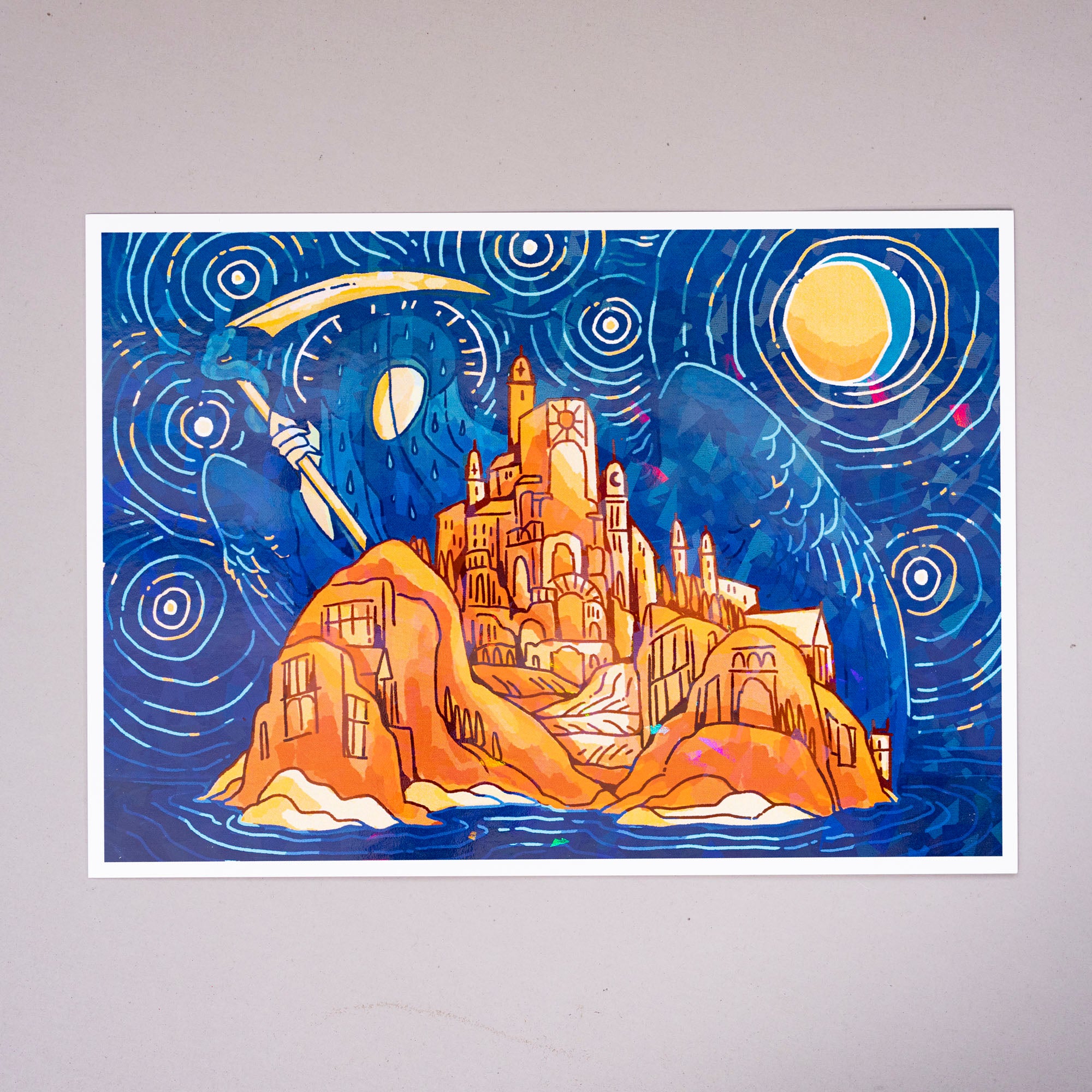 My illustration for Angeltober 2022, for the prompt "Orrery."The print is 5 x 7 inches (12 x 17 cm) and holographic. It is printed on heavy cardstock and has a white border.