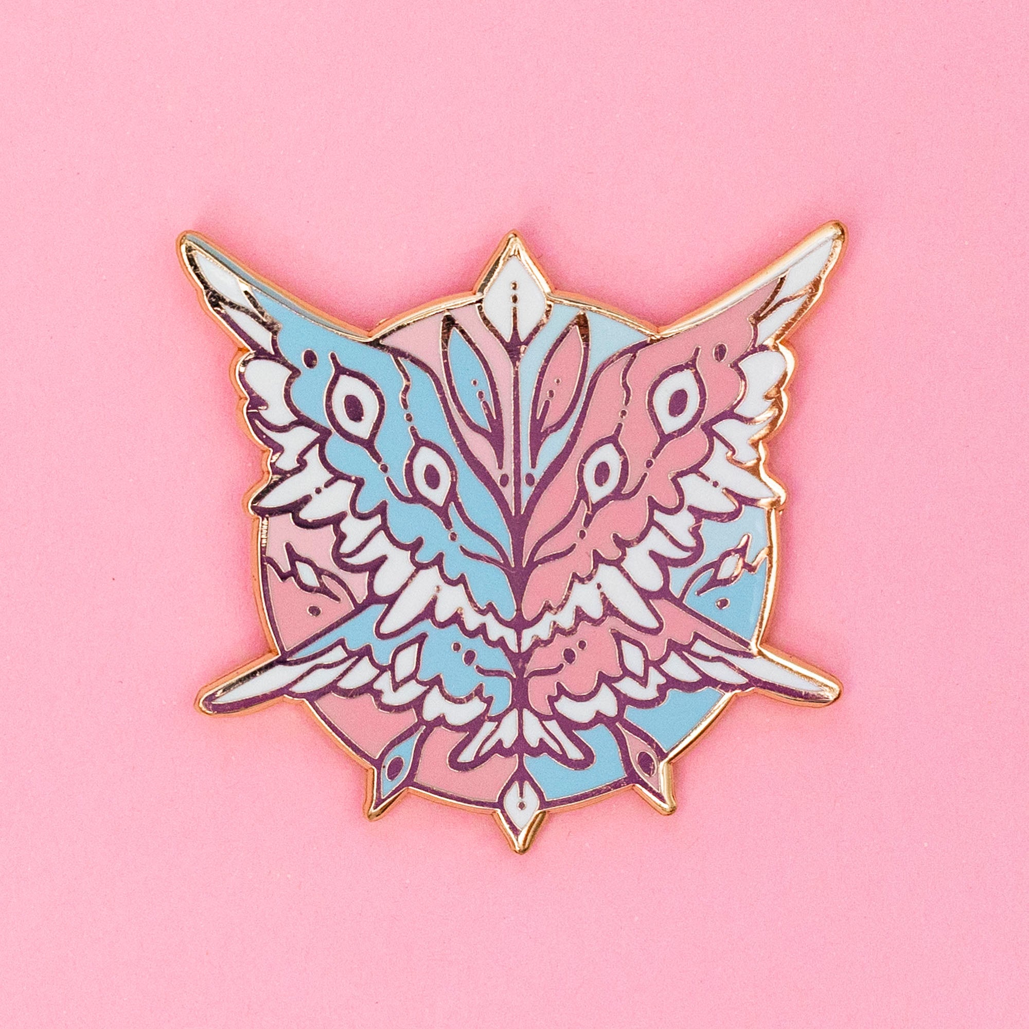 A moth-like seraph with pink and blue wings, for Transgender pride.