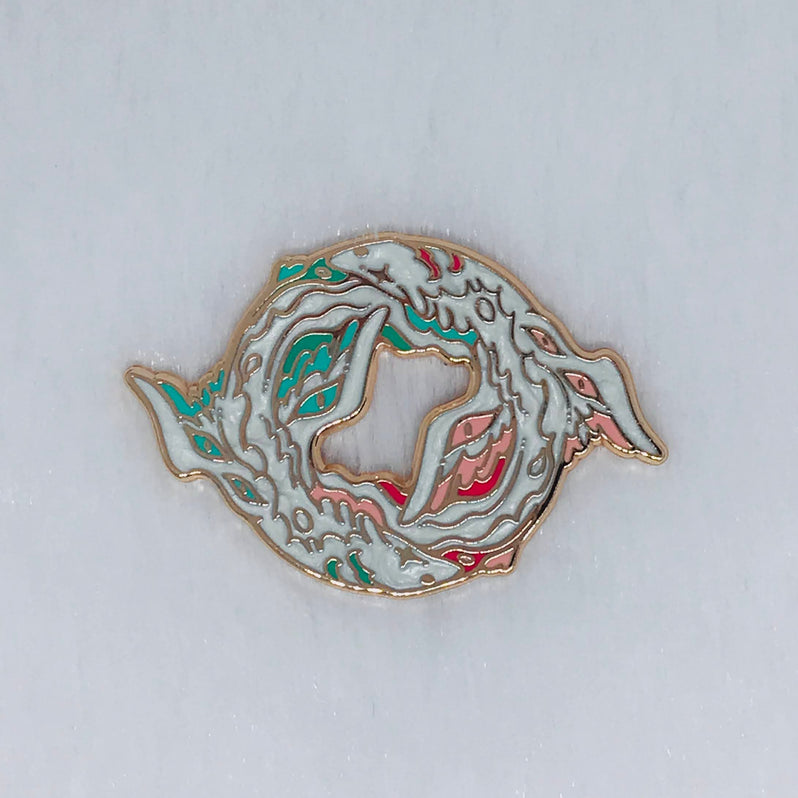 A pair of angelic serpents made of clouds, for Abrosexual pride.Please note there is a small section of white enamel instead of pink on one of the wings.This pin is approximately 1.8 in (4.7 cm) on its longest side. The pin has hard enamel, rose gold plating, pearlescent white enamel, and two pin posts with rubber clutches.This listing is for standard grade pins only. Standard grade pins may have one or two tiny imperfections.