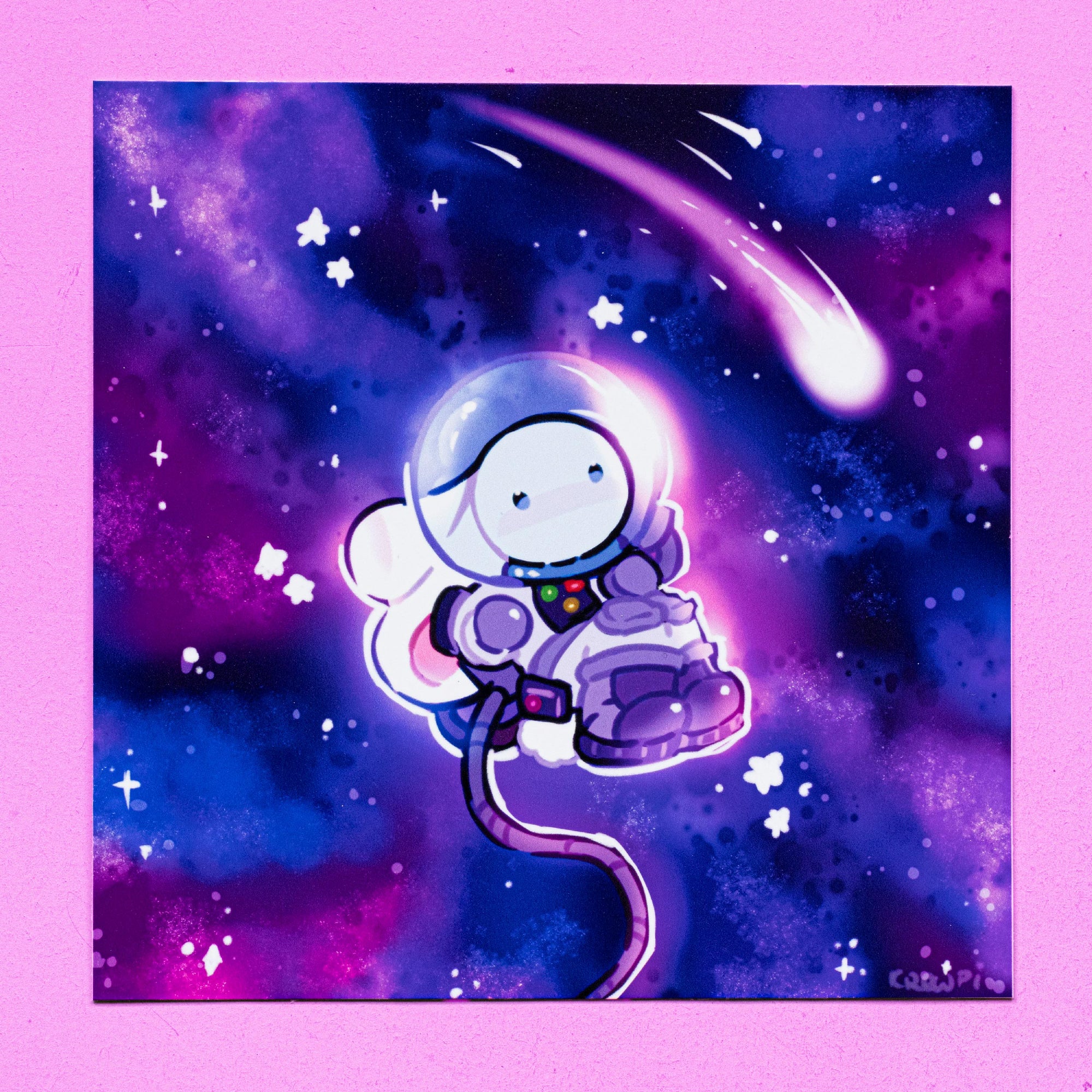 A lone bunny astronaut floats in the endless sea of space, her only company the millions of twinkling lights