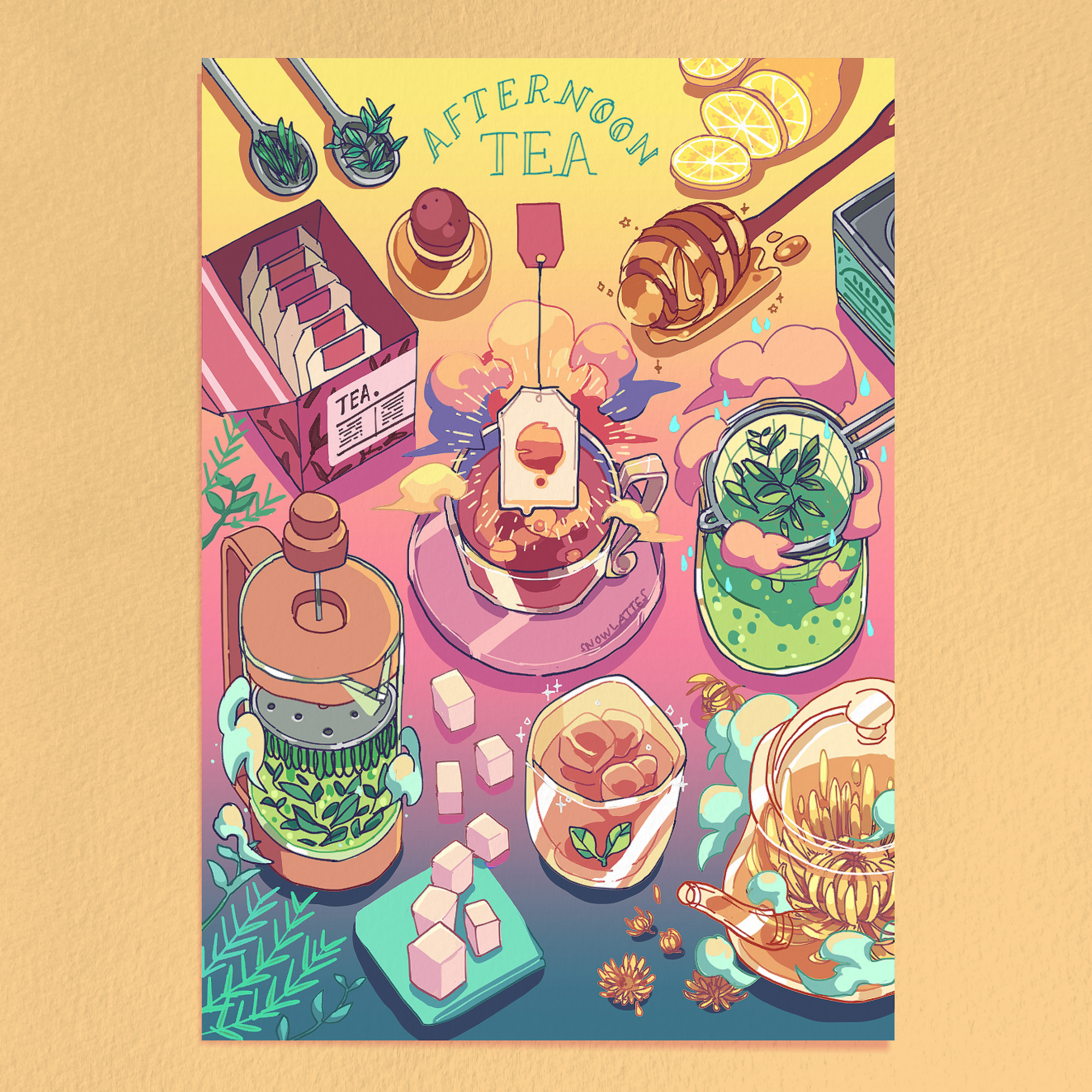 Take a break, stretch out and go get yourself a warm cup of tea this afternoon. You deserve it! What kind of tea do you prefer? Honey or sugar? Perhaps with a dash of lemon? Nothing's better than a little afternoon break after work, as shown in this print beautifully illustrated by Snowlattes.