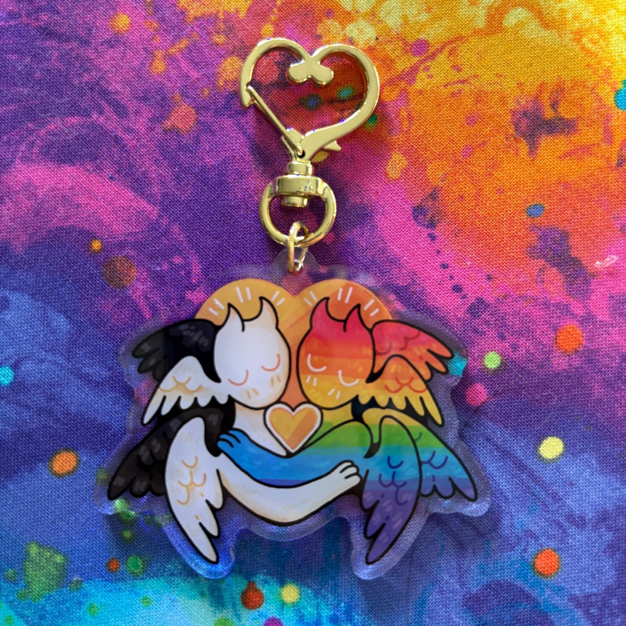 | This acrylic keychain is 2.5 inches (6.3 cm) on the longest side, double-sided with the same print on both sides; it has a gold heart clasp. |