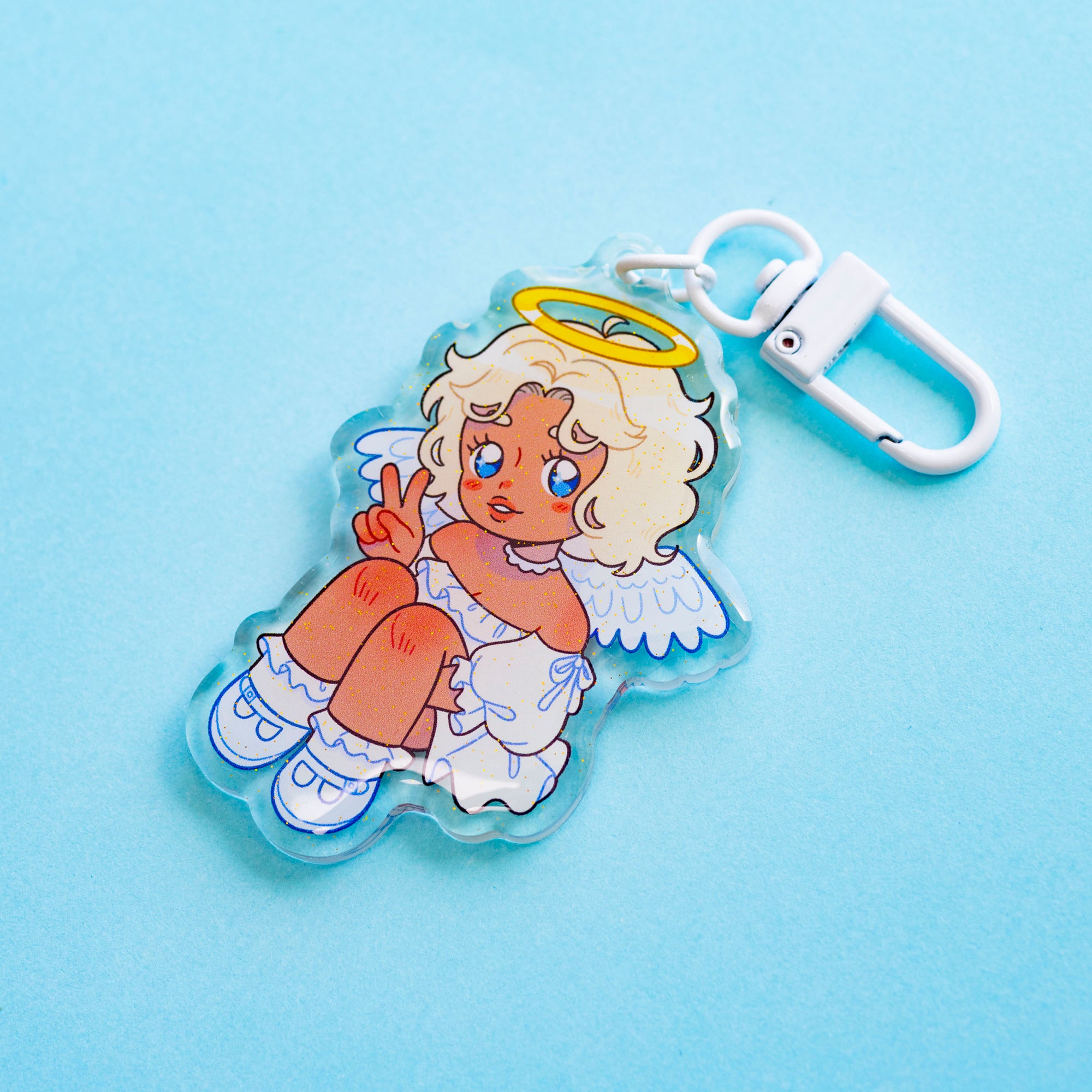This cute angel acrylic keychains is double-sided and measures 2.5” tall. It has a glitter epoxy coating. Perfect for decorating your keys, backpack, tote bag, and more! PLEASE NOTE: most keychains have a plastic film on the back side that you will need to peel off.