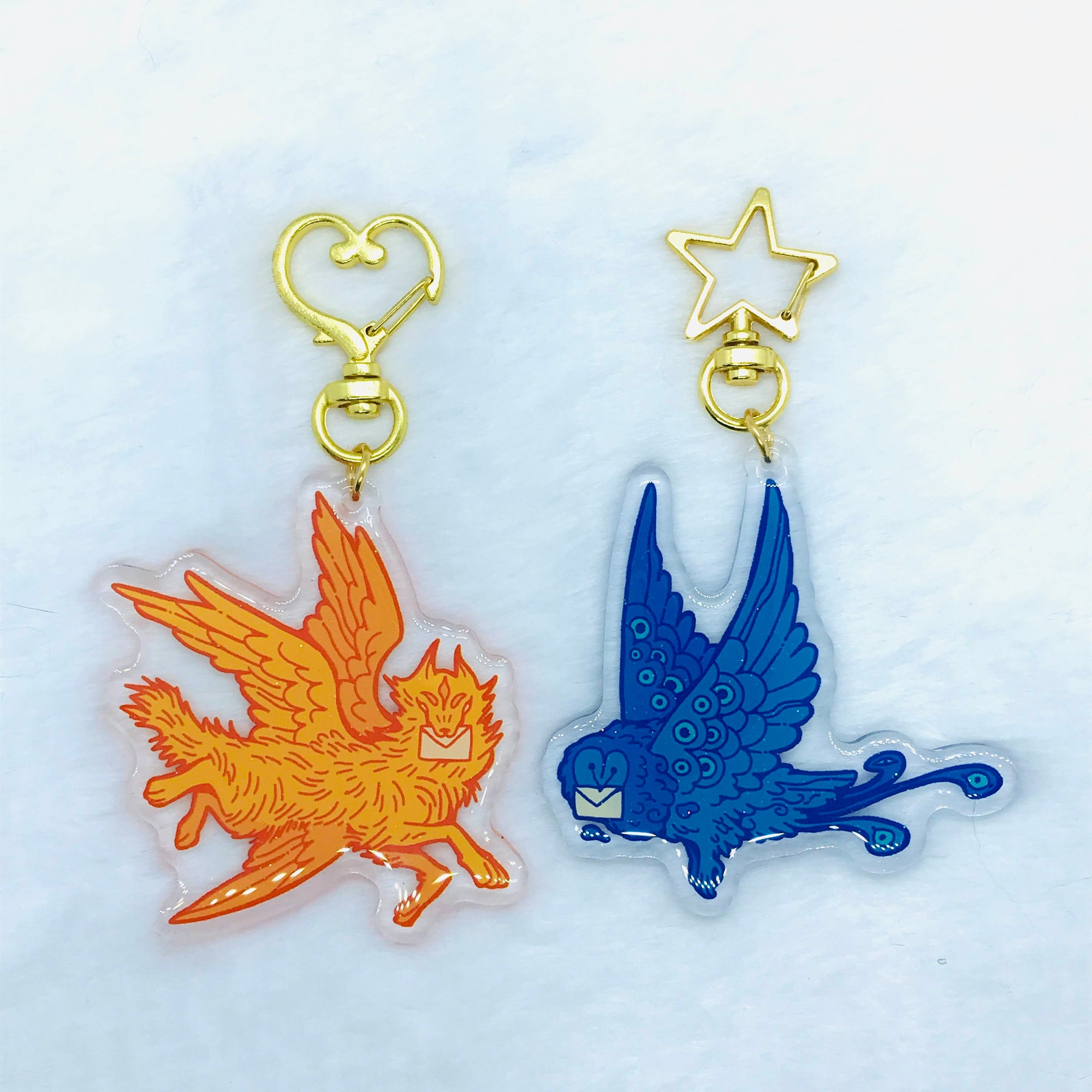 A pair of angelic messengers. Each keychain is about 2 inches (5 cm) on the longest side, with glitter epoxy on one side.