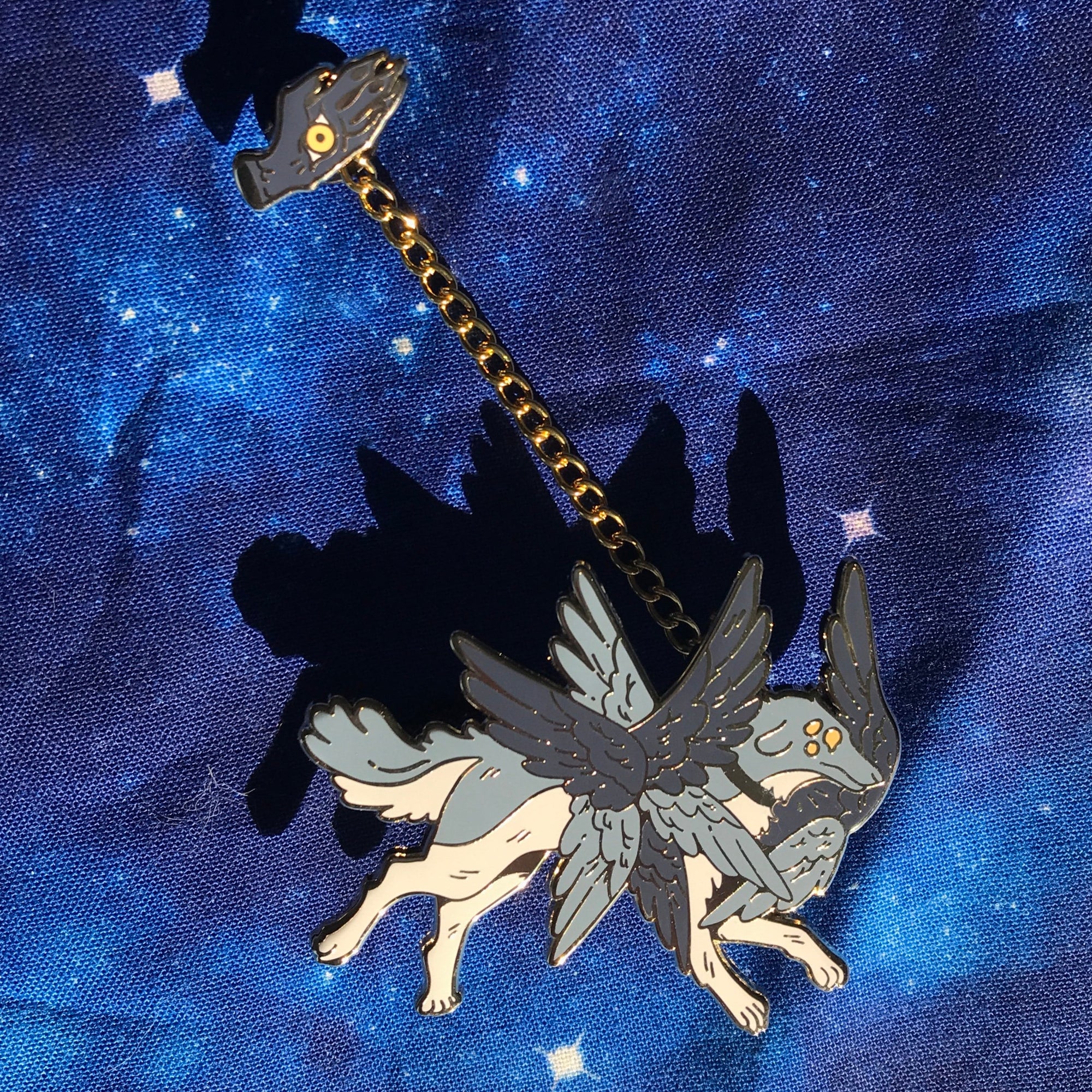 The main pin has two pin posts, the hand has one. The chain attaches to the pin posts on the back of the pins. The chain is detachable so you can display the pins however you like. The main pin is 2 inches (5 cm) long, the hand is a little under 1 in (2.5 cm). Each pin has gold plating and hard enamel.This listing is for mixed grade pins. You may receive a standard grade pin, which has minimal or no flaws; or a seconds grade pin, which may have more notable flaws. Please do not purchase this listing unless you would be satisfied with a potentially seconds grade pin. For my complete pin grading policy, please see my About & FAQ: linktr.ee/ultra.infinite