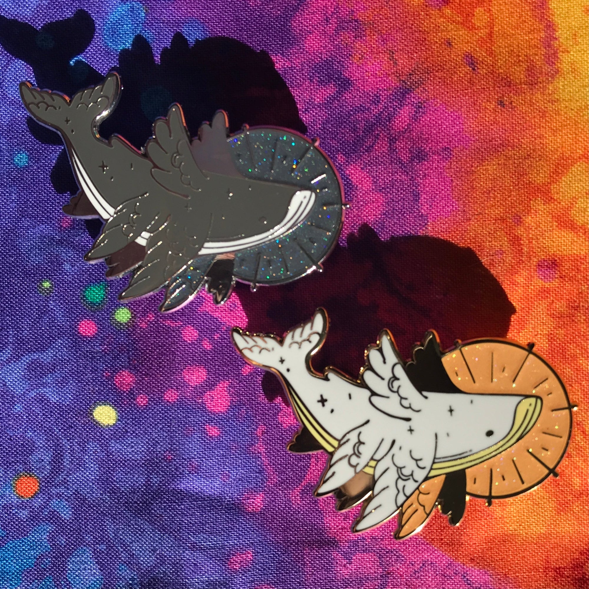 This design is inspired by the state marine animal of Hawaii, and one of my personal favorite marine animals: the humpback whale. It is available in two colorways: silver plated with black enamel, and gold plated with white/yellow enamel. Each colorway has glitter accents and hard enamel. Pins come with two pin posts and rubber backings.This listing is for mixed grade pins. You may receive a standard grade pin, which has minimal or no flaws; or a seconds grade pin, which may have more notable flaws. Please do not purchase this listing unless you would be satisfied with a potentially seconds grade pin. For my complete pin grading policy, please see my About & FAQ: linktr.ee/ultra.infinite