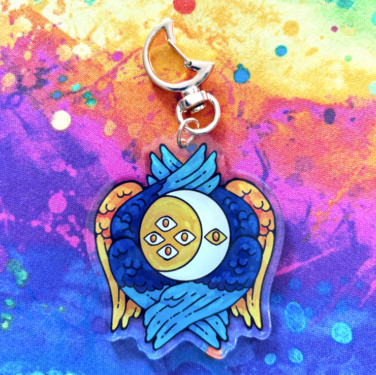 | This acrylic keychain is 2.5 inches (6.3 cm) on the longest side, double-sided with the same print on both sides; it has a gold moon clasp. |