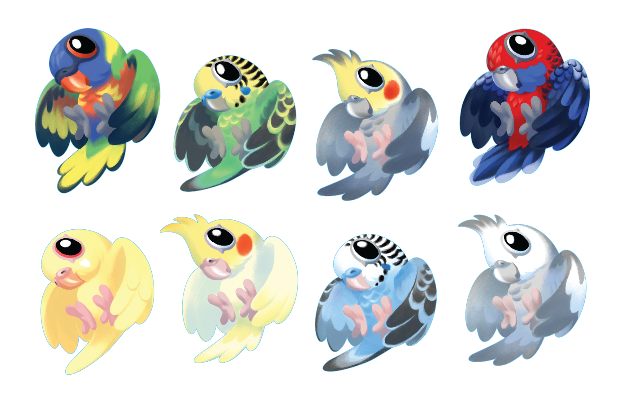 Some favourite Aussie parrots, now as stickers! These stickers are full bleed kiss cut, meaning there's no white sticker border around them - the art goes right to the edge of the sticker! Once you peel them off they're perfect little parrot shapes that will fit in on whatever background you stick 'em! The full sheet measures 4x6 " and each individual sticker is about 1.5 inches high. This glossy weatherproof clear vinyl will hold up to 2-4 years of outdoor use / heavy handling too! Great for phones, handheld consoles, vehicles, etc.