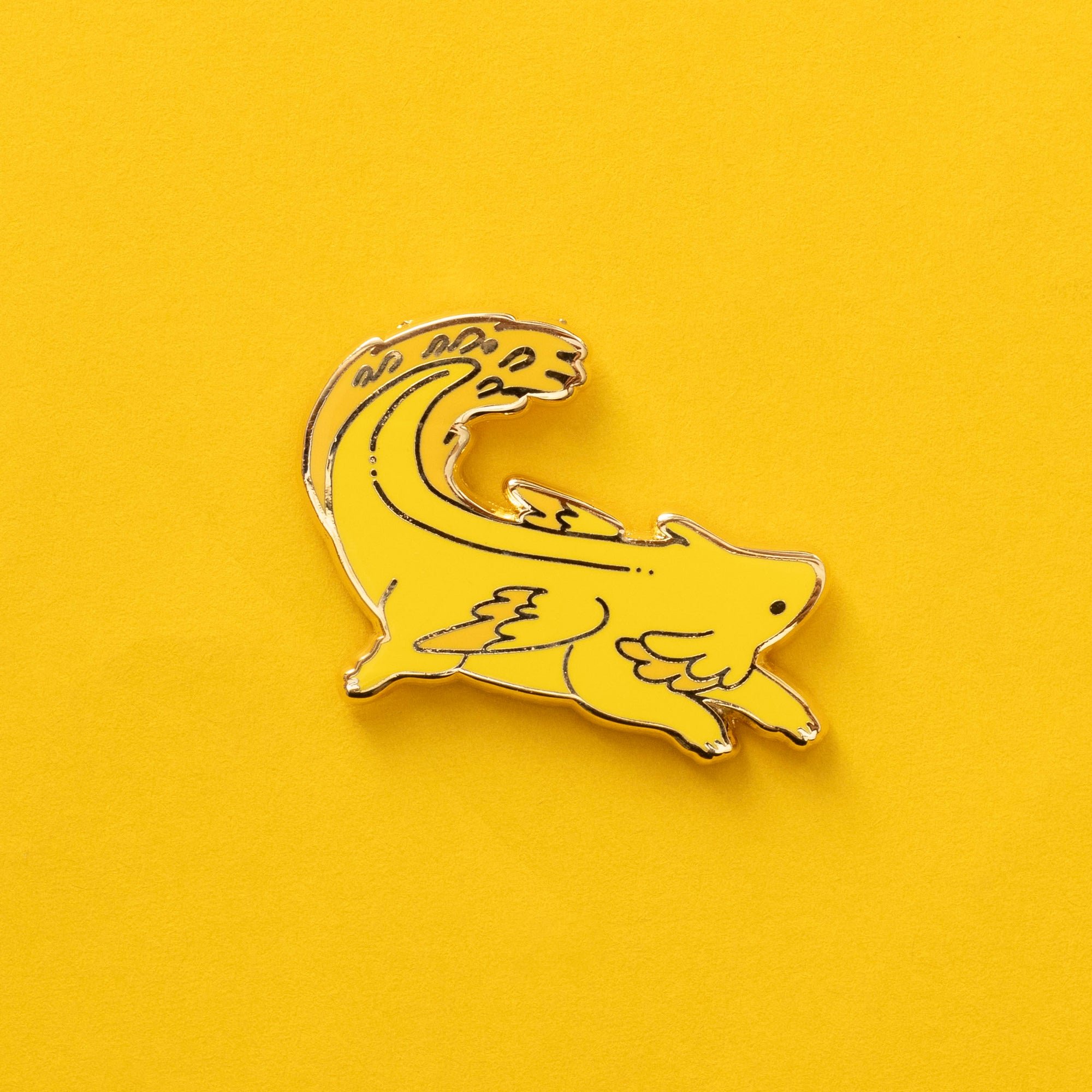A collection of little axolotl angel pins!Each pin is approximately 1 inch (2.5 cm) long. Each pin has rubber clutches, two pinbacks, and hard enamel.The axolotl angels are available in the following colors:Green, brown, and yellow with gold platingBlue with silver plating