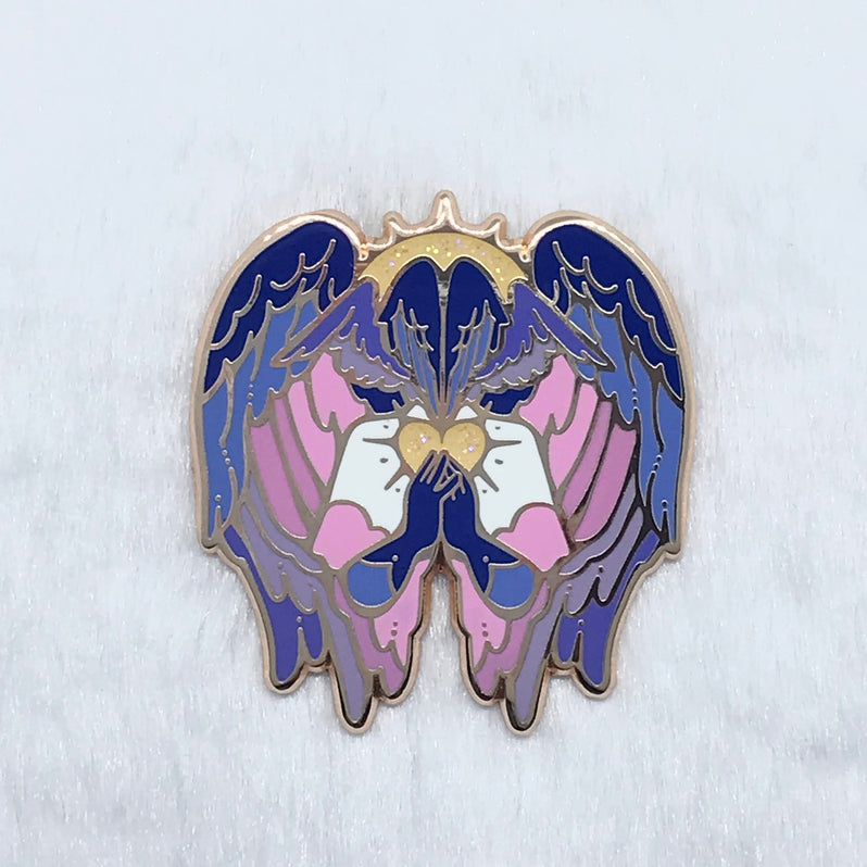 A blue and pink angel for Bigender pride.This pin is approximately 1.6 in (4 cm) long. The pin has hard enamel with glitter accents, rose gold plating, and two pin posts with rubber clutches.This listing is for standard grade pins only. Standard grade pins may have one or two tiny imperfections.