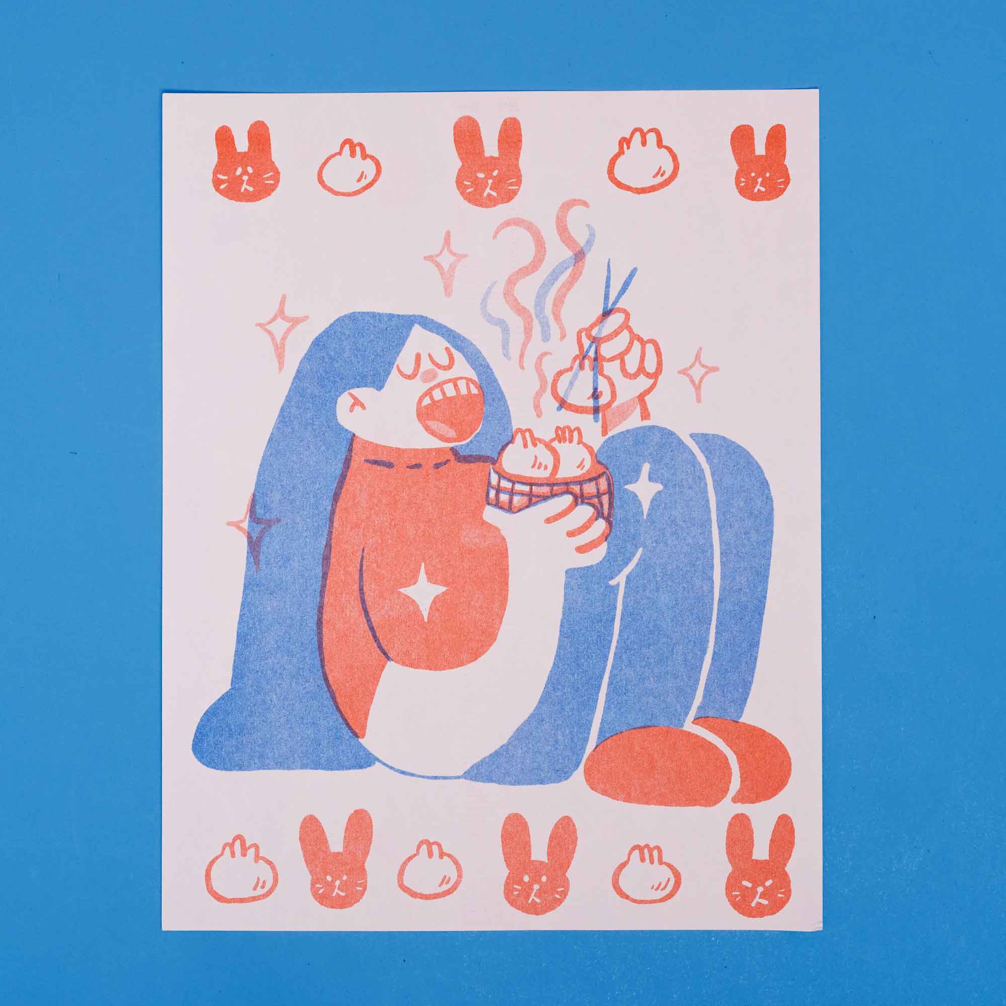 This was my first ever riso print! Just eating some steamed buns, surrounded by more steamed buns.