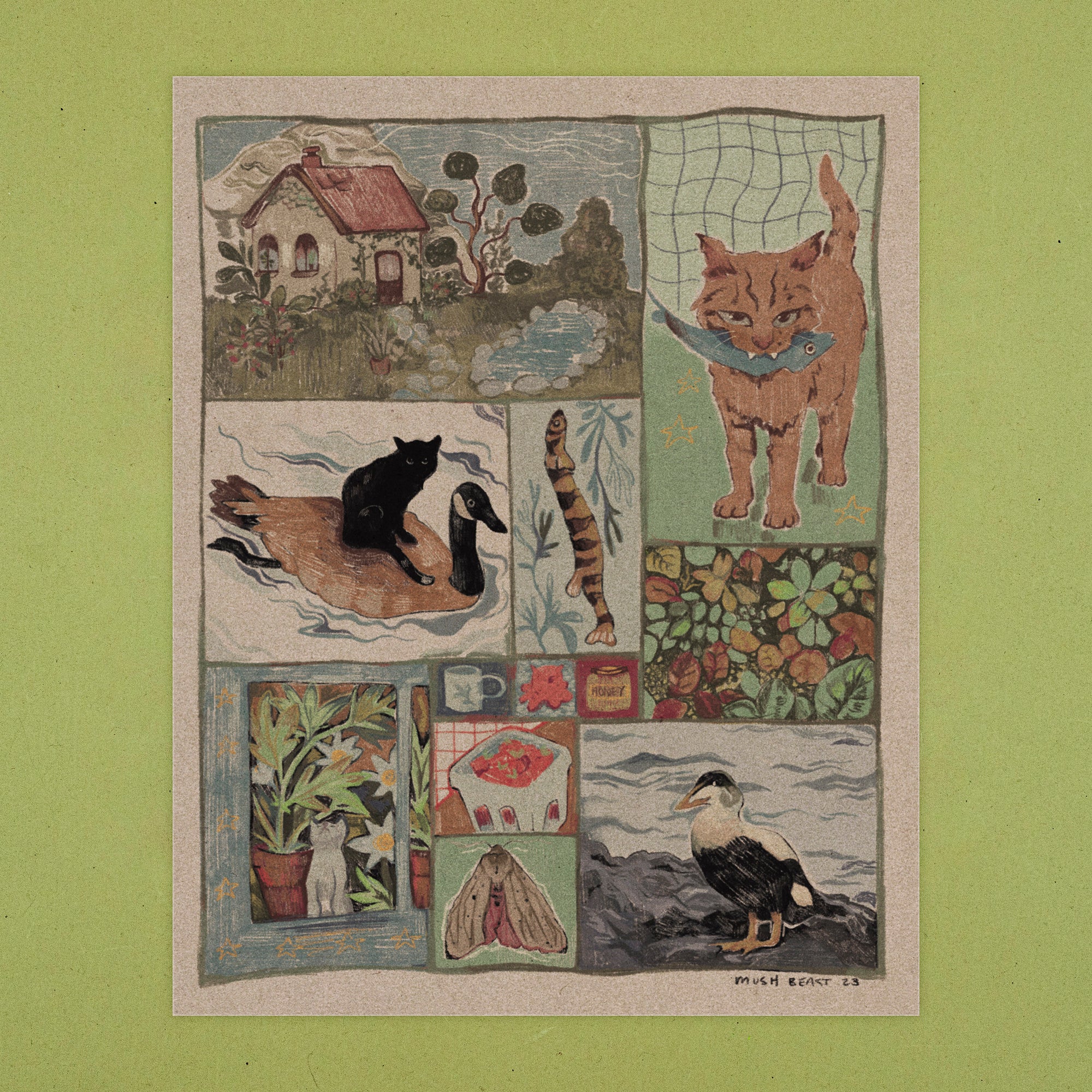 an illustration of cats, birds, and mudane items that can bring a sense of coziness to your home.