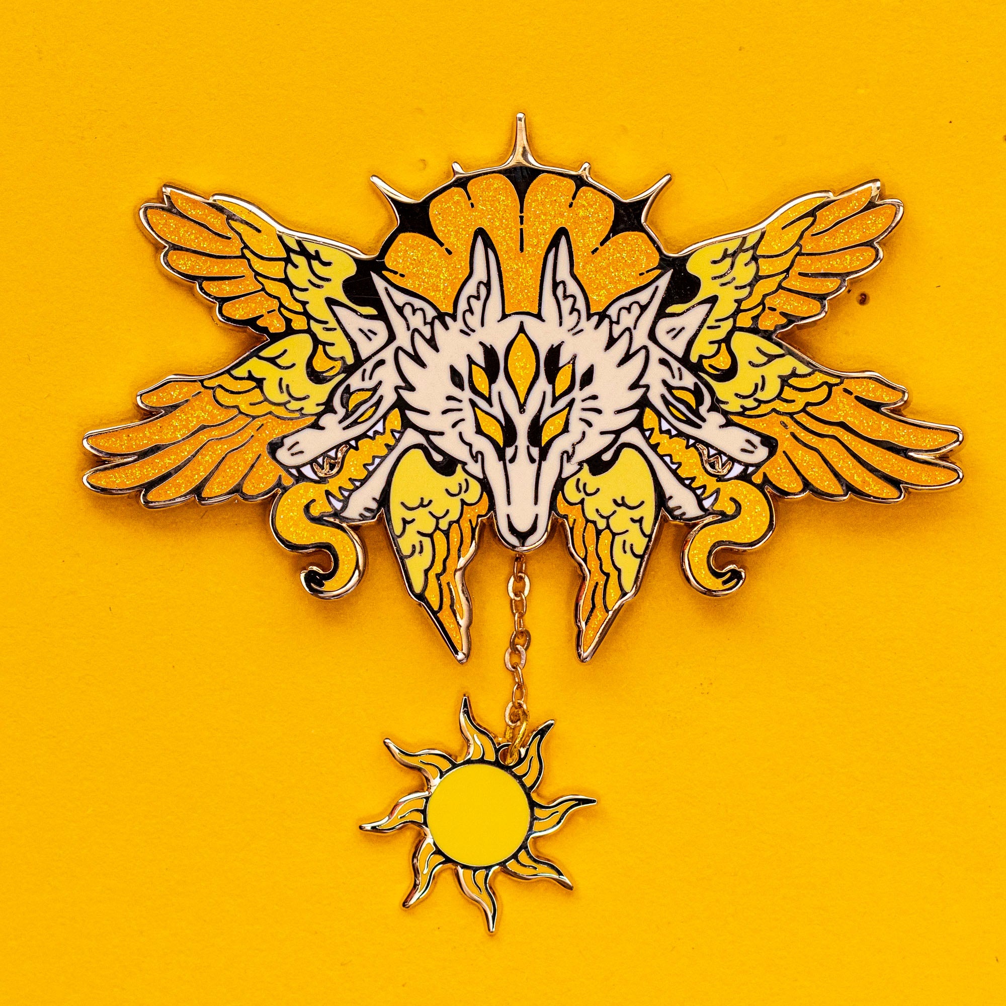 Cerberus is available in gold plating with white and yellow enamel; or black nickel plating with gray and pink enamel. The black nickel colorway is the winner of the Angeltober 2022 Cerberus Coloring Contest, the palette is by beetle.tooth: instagram.com/beetle.tooth