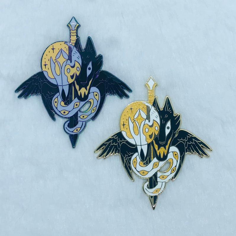 Chalkydri are many-winged angelic serpents, often depicted with the head of a crocodile and the feet and tail of a lion.This pin is approximately 2 in (5 cm) wide. The pin has two pin posts with rubber clutches. Chalkydri is available in rainbow plating with soft enamel and epoxy; or gold plating with hard enamel and glitter accents.Rainbow plating is unique for every pin - no two are alike with differing metal colors. The plating may appear different than the example images shown in this listing.This listing is for standard grade pins only. Standard grade pins may have one or two tiny imperfections.