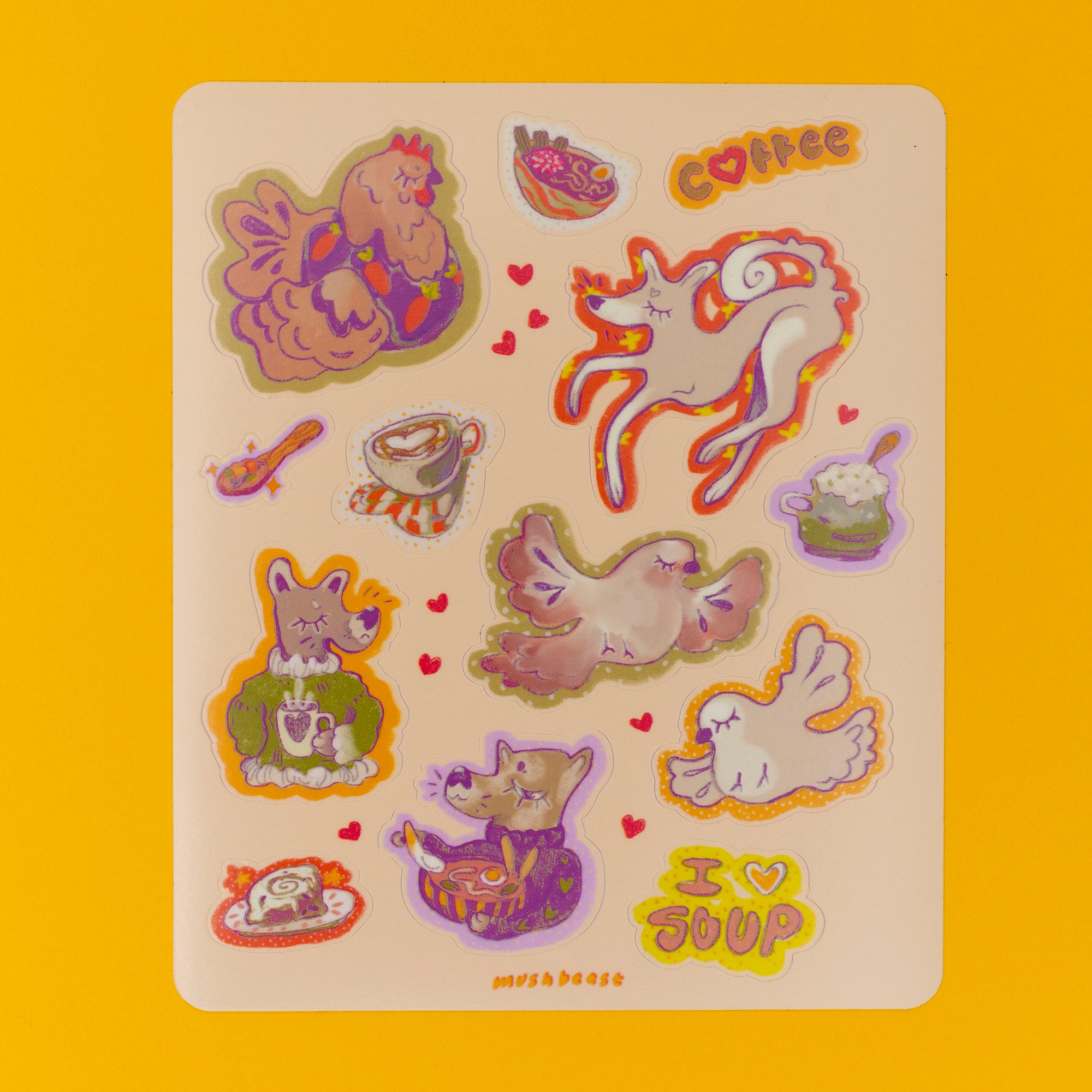 these stickers are printed on eco natural paper, so they are NOT suitable for water and outdoor use long-term and are more so meant for journals, sketchbooks, calendars, and decorating items that stay dry + outside of UV rays.5 x 6" with 13 stickers! perfect for cozy homebodies who love soup, coffee, sweaters, and cozy animals.