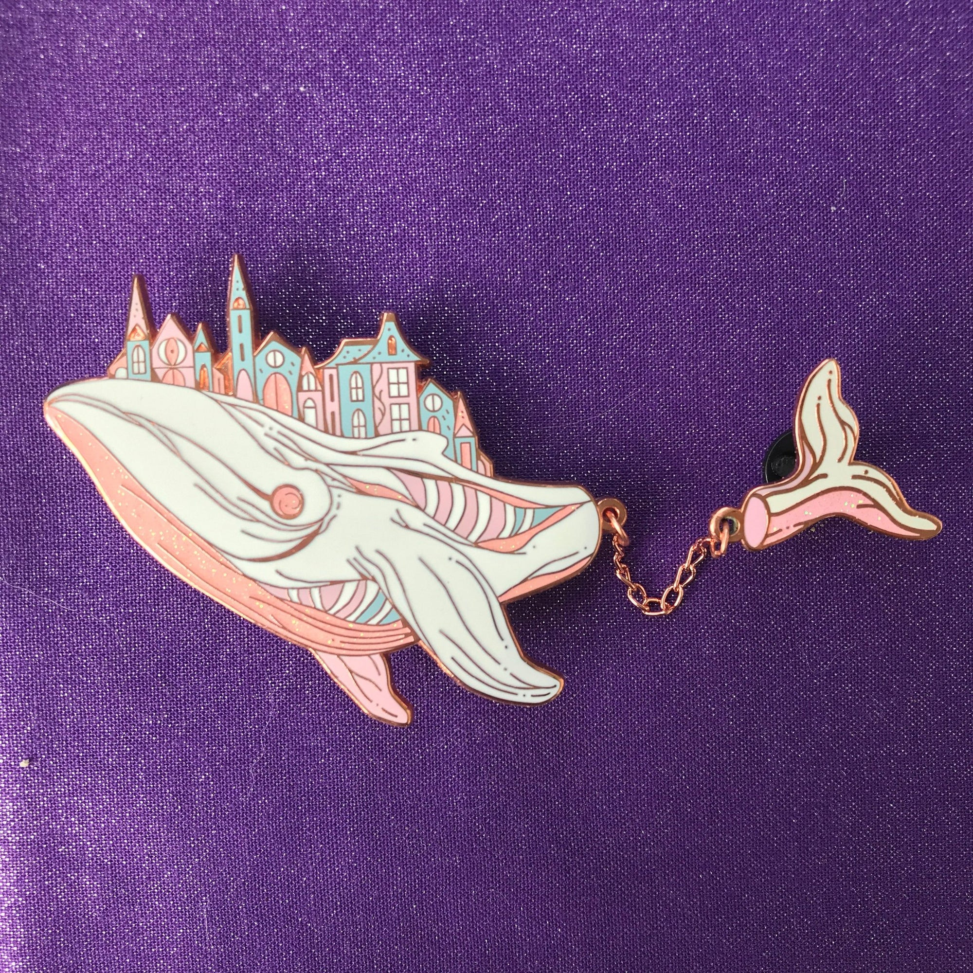 | Deadwale: a city of whale oil, steam, and secrets. This pin is based on one of my Dungeons and Dragons campaign settings, which takes place in a giant floating whale. The pin consists of two parts, connected by a chain. The whale body is approximately 2.5 inches (6 cm) long, while the tail is about an inch long (2.5 cm). The pin has hard enamel and recessed metal detailing. It has two pinbacks with rubber clutches on the whale body, and one pinback on the tail. This variant has rose gold plating and glitter accents. |