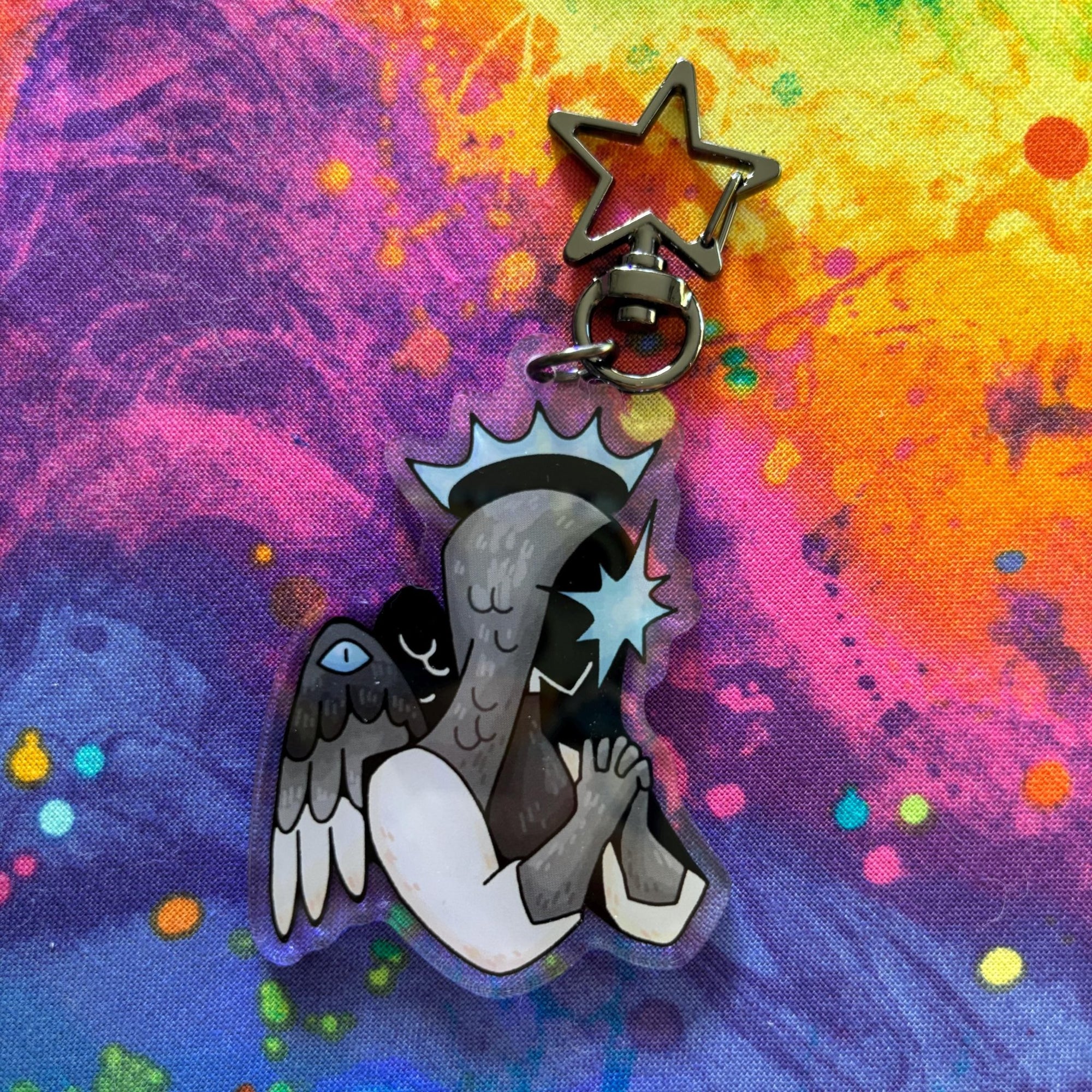 | This acrylic keychain is 2.5 inches (6.3 cm) on the longest side, double-sided with the same print on both sides; it has a gun metal star clasp. |