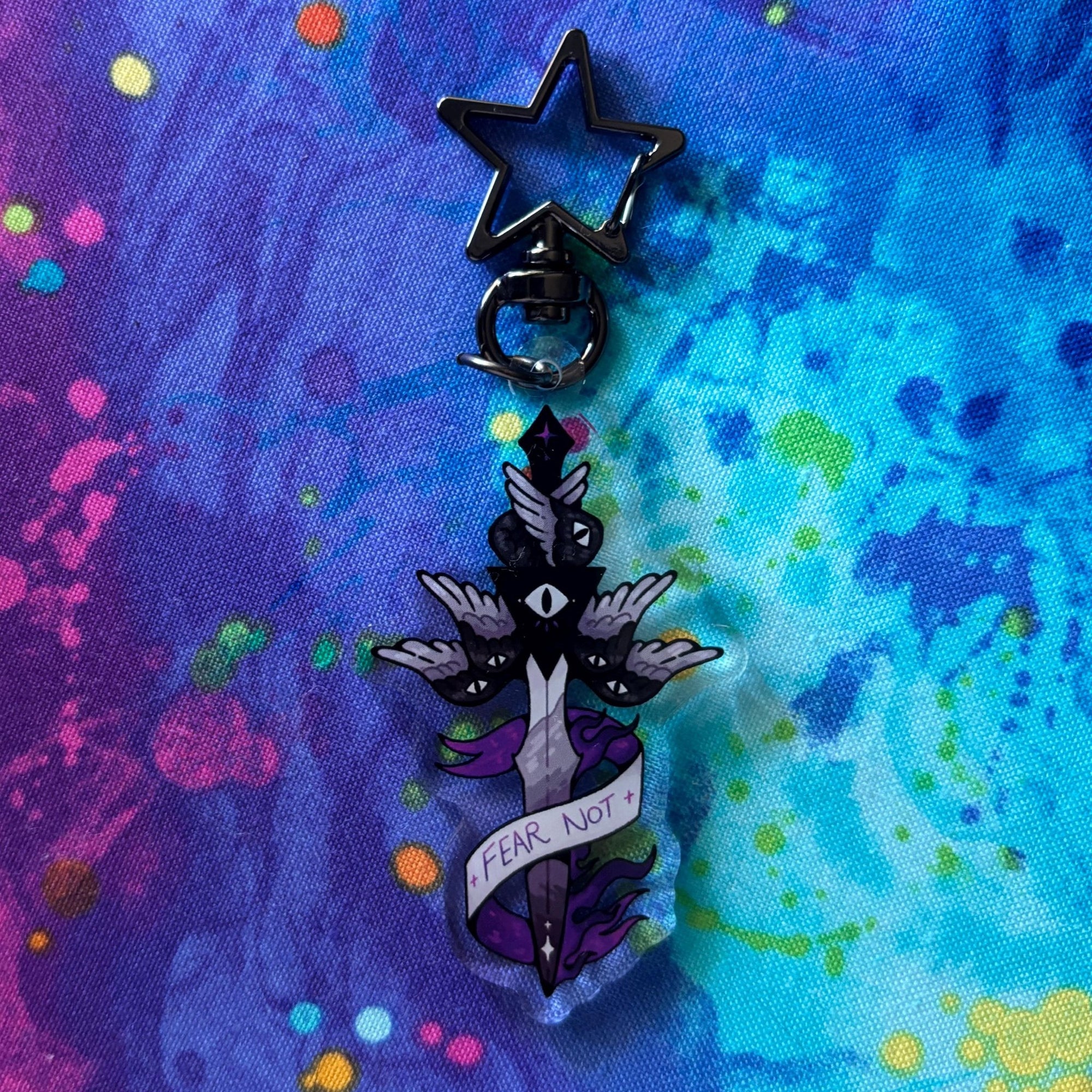 This acrylic keychain is 2.5 inches (6.3 cm) on the longest side, double-sided with the same print on both sides; it has a gun metal star clasp.