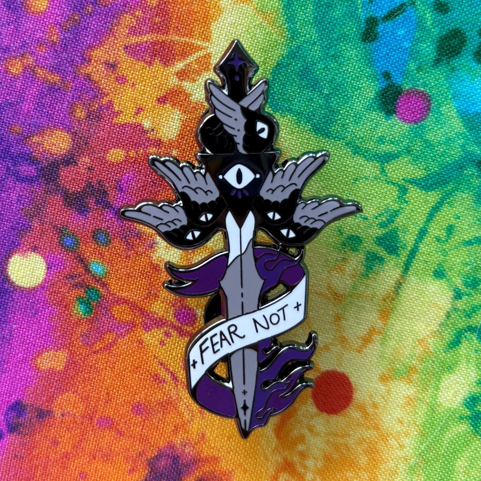 | This pin is 1.9 inches long with black nickel plating. It has hard enamel, two pin posts, and rubber backings. |