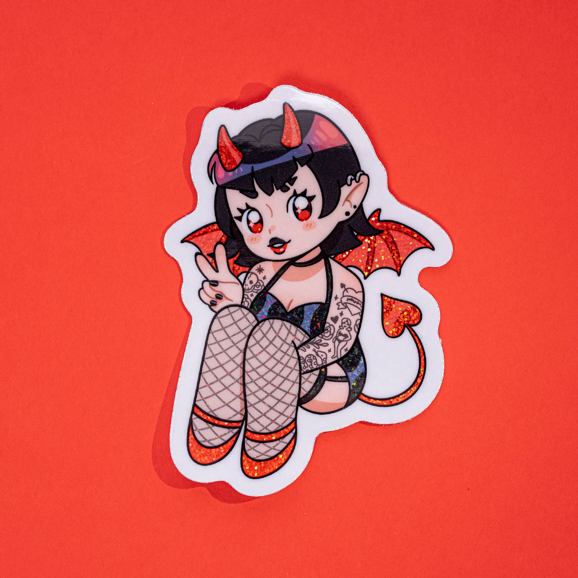 This devil sticker 3โ tall and has a holographic glitter finish. These stickers are perfect for decorating your laptop, water bottle, journal, and more!