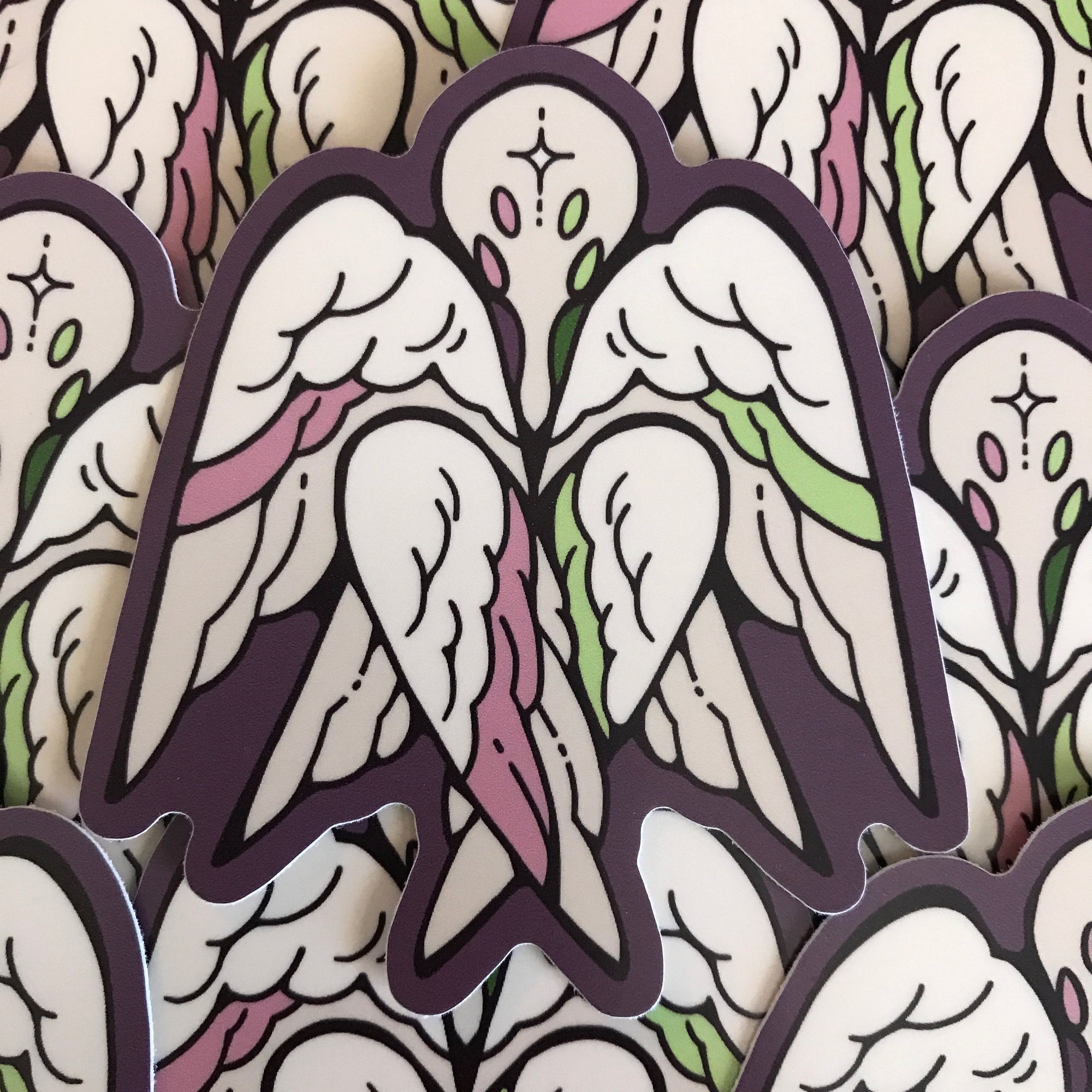 A many-winged bird skull angel for Diamoric pride.This sticker is approximately 3 inches (7.6 cm) on the longest side, and printed on matte vinyl.