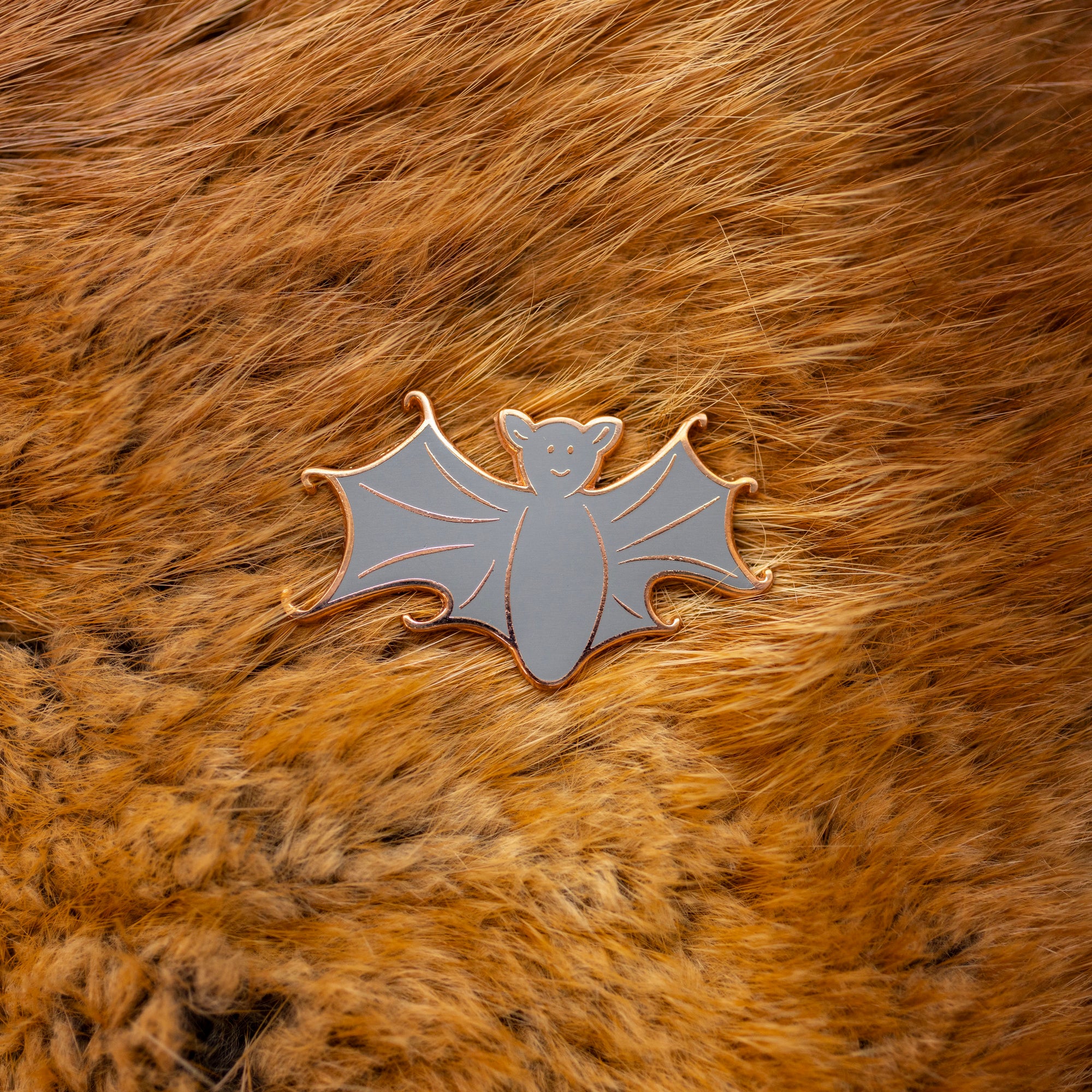 A Happy Batty Little Chap! Named for the way bats “dive past” the windows at dusk. 1.8 inch hard enamel pin, copper plated, two posts, rubber clutches & back stamp