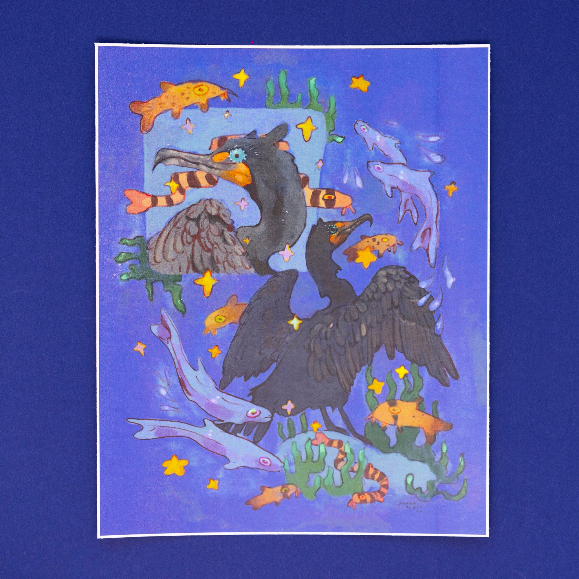 double crested cormorants amongst cory catfish, kuhli loach, and assorted fishies from my brain (and a sprinkle of stars, of course).