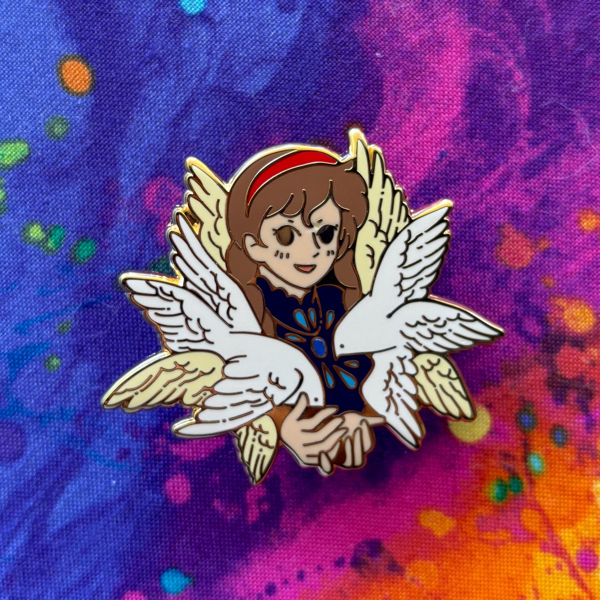 | Inspired by the scene in "Castle in the Sky" of Sheeta and the doves. This pin has hard enamel, gold plating, and is 1.9 inches wide. It has two pin posts with rubber backings. |