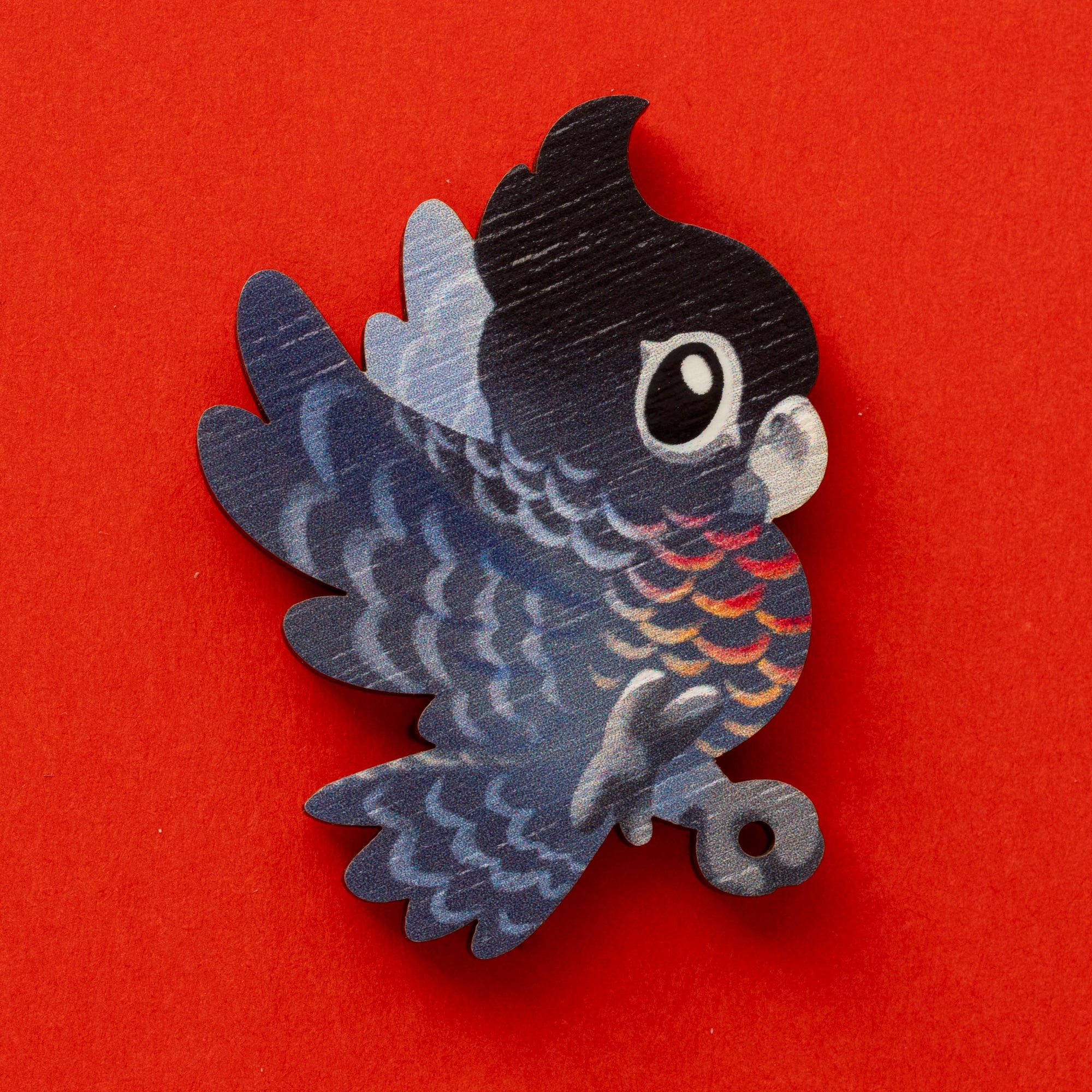 These little Aussie cockatoo pins are printed in full colour on sustainably sourced wood! They have two pin posts on the back to keep them securely in place wherever you put them (unlike the real thing) and feature a little gloss finish on their eyes for that extra spark of life when they catch the light.